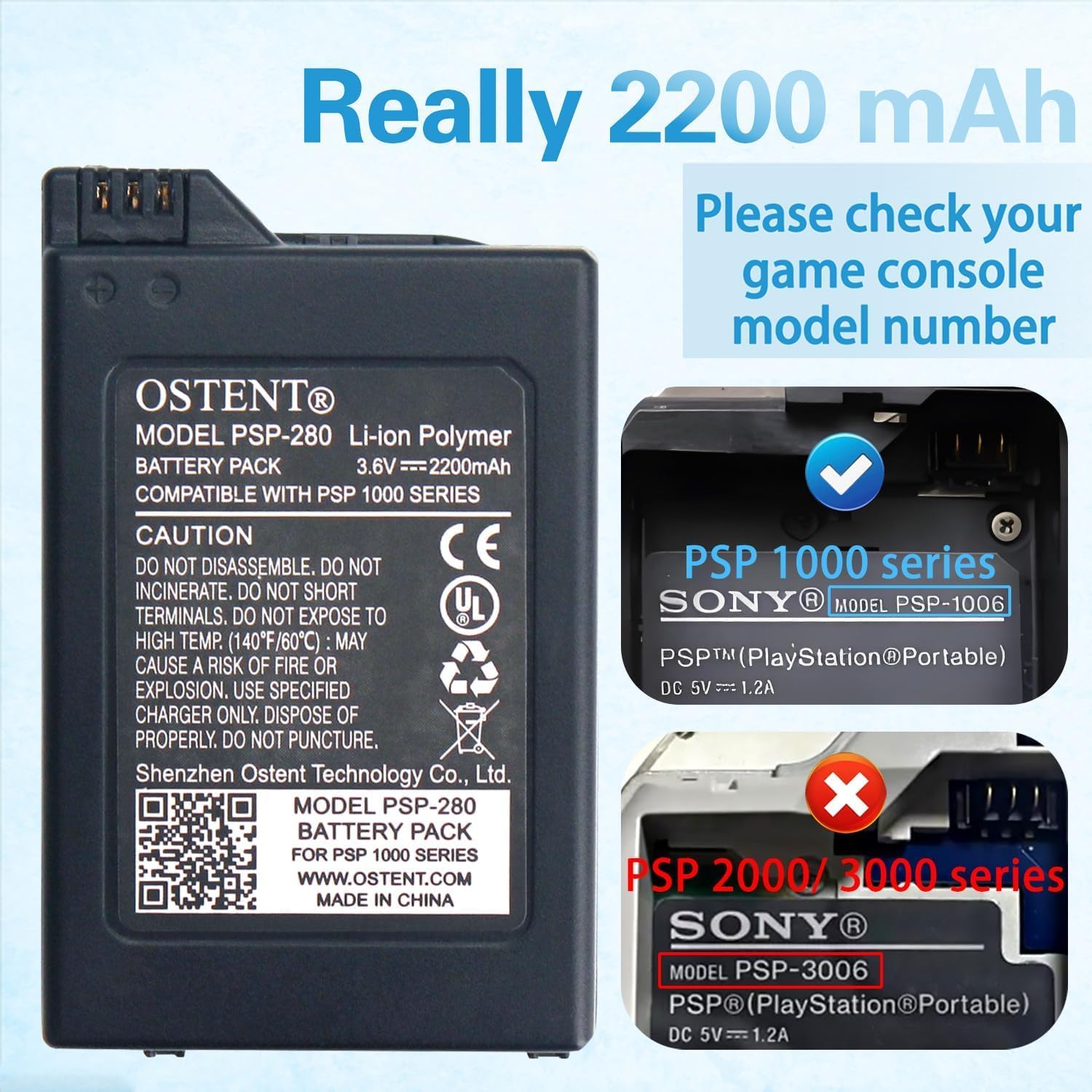 Features: *Brand new *High capacity quality lithium ion polymer battery pack *Fits right in the battery slot, and you cover it with the battery cover for PSP *Voltage: 3.6V *Capacity: real 2200mAh *Model: PSP-280 *Upgraded version of 1800mAh PSP-110 battery pack for Sony PSP 1000 series, enjoy 30% more gaming time compared to standard battery. *Rechargeable and no memory effect *Advanced safety protection, built-in over-charge, over-discharge, over-current,over-voltage, and short-circuit protection for safe usage *Note: never run out of battery power when you are about to score the winning point Package includes: *1 x 2200mAh battery pack Compatible with battery part number: *PSP-280 Compatible with model: *Sony PSP 1000 (1001, 1002, 1003, 1004, 1005, 1006, 1007, 1008, 1010), PSP Fat (Not for PSP-2000/3000) Brand: *OSTENT. A quality product by OSTENT.