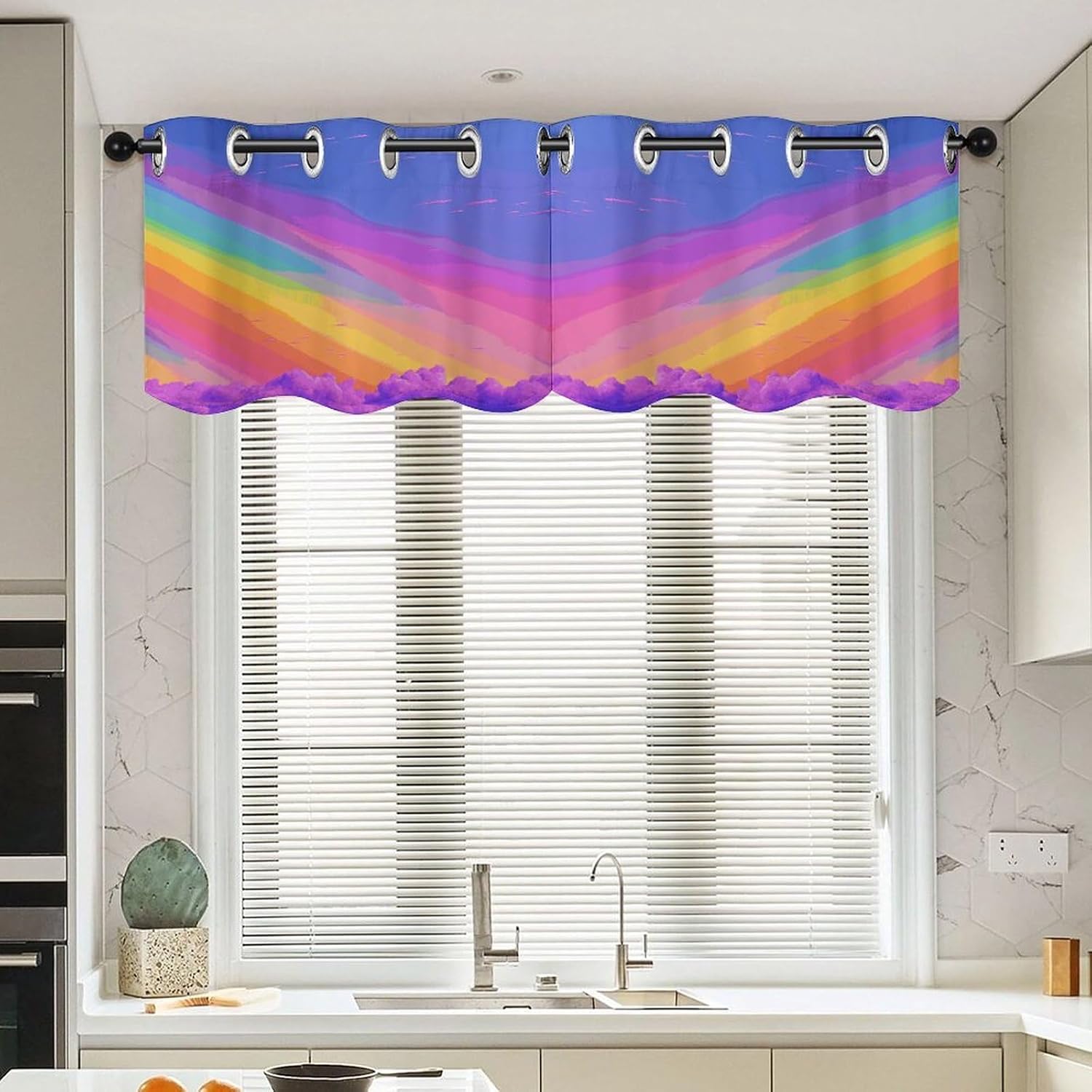 Perfect Pair Printed Curtain - Rainbow Aesthetic Light Filtering Modern Window Décor Elevate your windows with our beautifully designed two-piece Rainbow Aesthetic curtain set, combining a functional printed curtain with an elegant coordinating valance. Crafted for versatility, this Rainbow AestheticCurtain is the ideal solution for adding privacy, style, and controlled light to any room. Premium Fabric & Modern Design: Crafted from premium fabric, this Rainbow Aesthetic Curtain maintains a soft hand-feel and a graceful drape over time. The elegant print and smooth texture provide a sophisticated look that enhances your home's ambiance. Optimal Light Filtering & Protection: This Rainbow Aesthetic modern curtain effectively filters harsh sunlight, creating a softly illuminated and comfortable atmosphere. It helps protect your furniture and flooring from UV damage while providing a good level of privacy. The fabric is resilient and designed for easy care. Versatile Application: This Rainbow Aesthetic ready-to-hang Curtain is designed for broad compatibility. The curtain features standard 4.5cm grommets for smooth gliding on most curtain rods. With dimensions of 52" W x 18.1" H per panel, it's perfectly suited for various window styles. Ideal as a charming kitchen curtain or cafe curtain for bottom-up coverage, it also functions perfectly as a tier curtain. Whether you're looking for a stylish printed curtain for your living space, a functional light filtering curtain for a bedroom, or a complete look with a curtain valance, this Rainbow Aesthetic set delivers both style and purpose. Set Includes: Two printed curtain panels Bring a cohesive and stylish upgrade to your home with this Rainbow Aesthetic versatile curtain .