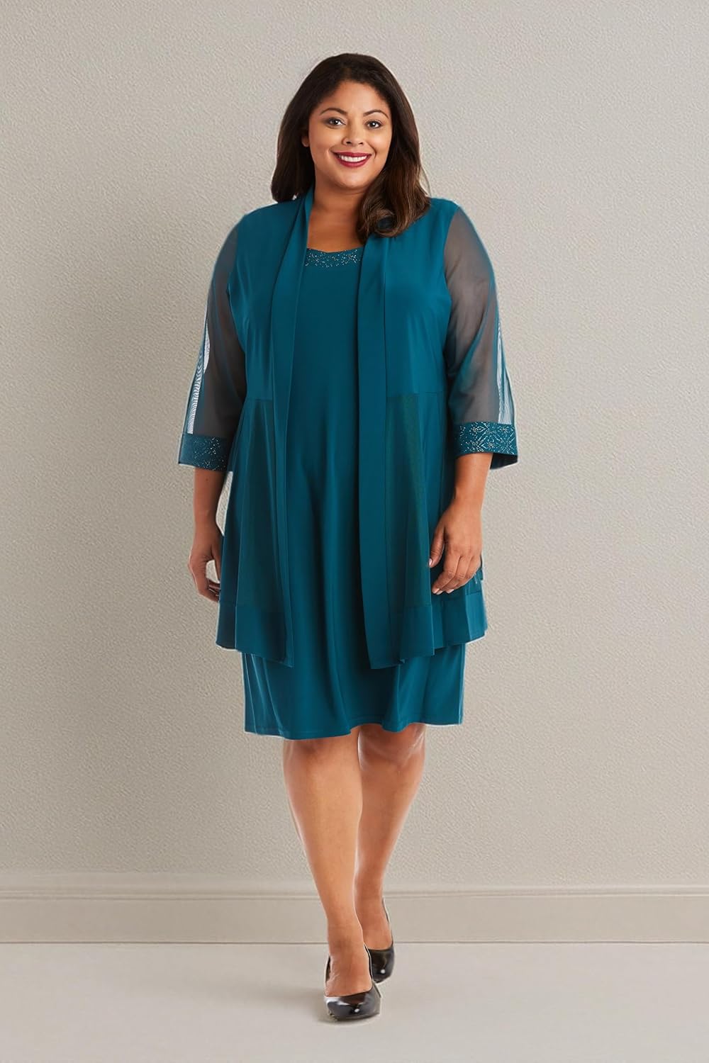 Soft, graceful and unforgettable-this graceful jacket dress is your go-to ensemble for moments that matter. The sheer jacket floats gently over a classic sheath dress, its dreamy pleats adding texture and movement with every step. Subtle metallic thread embroidery adorn the neckline and cuffs, offering just the right amount of shimmer. Whether you're attending a wedding, formal dinner, or elegant celebration, this lightweight set flatters a variety of body types and comes in an array of stunning colors to suit your personal style.