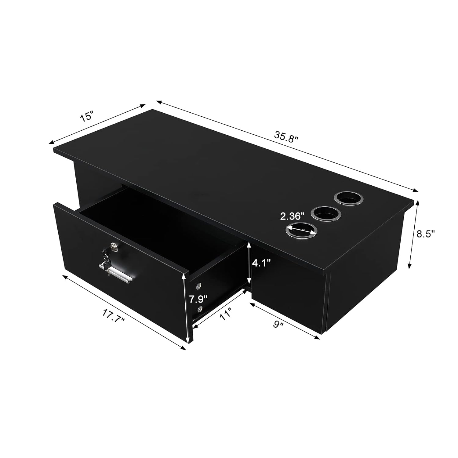Specifications:1. Material: Particle board and zinc alloy metal ring2. Color: Black3. Dimensions: (35.8 x15 x 8.5)" / (L x W x H)4. Drawer Dimensions :17.7"L x11"W x 4.1"H; 5. 3 zinc alloy metal ring Diameter:2.36*2.36"6. Weight:33 lbs / 15 kgPackage Includes:1 x Wall Mount Hair Styling Station1 x English Manual