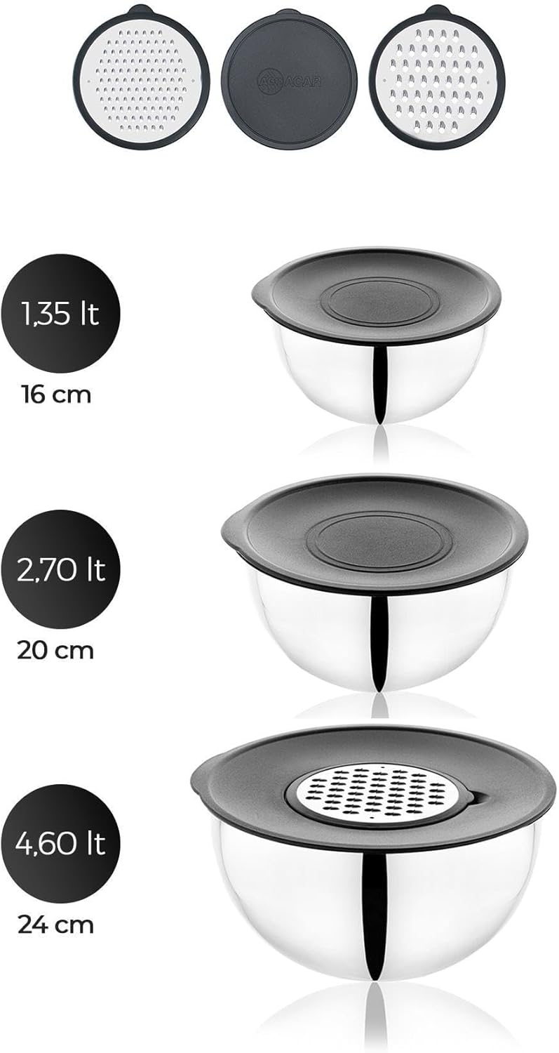 This 9-piece stainless steel mixing bowl set is a versatile addition to any kitchen. The set includes three bowls of varying sizes (16cm, 20cm, and 24cm), each equipped with a grater lid. These bowls are suitable for mixing ingredients, grating cheese or vegetables, serving dishes, and storing leftovers. The black color adds a touch of modern elegance to your kitchen decor. Crafted from high-quality stainless steel, these bowls are designed for durability and longevity. The stainless steel material is resistant to rust and corrosion, ensuring that the bowls will maintain their appearance and functionality for years to come. The grater lids are made from sturdy plastic and feature sharp grating surfaces for efficient food preparation. The bowls are designed to nest within each other, allowing for compact and convenient storage. This feature is especially useful for those with limited cabinet space. The grater lids fit snugly onto the bowls, preventing spills and keeping food during storage. Each bowl has a capacity of 1.35 liters, making them suitable for a variety of tasks. These mixing bowls are appropriate for home cooks, professional chefs, and anyone who enjoys spending time in the kitchen. They are suitable for preparing meals, baking desserts, and storing leftovers. The grater lids add an extra layer of functionality, making these bowls a versatile tool for any culinary enthusiast. To maintain the quality of these stainless steel mixing bowls, they are dishwasher safe. This makes cleaning up after meal preparation quick and easy. The grater lids can also be washed in the dishwasher, but hand washing is recommended to prolong their lifespan. This mixing bowl set makes a thoughtful and practical gift for weddings, housewarmings, and other special occasions. The set's versatility and durability make it a valuable addition to any kitchen, and the sleek black design adds a touch of sophistication. It's a suitable gift for anyone who loves to cook or bake.