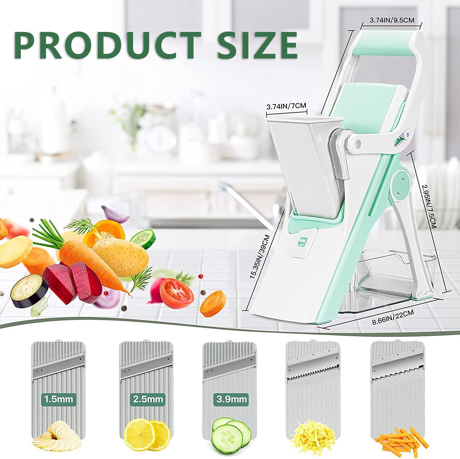 Introducing the Professional Mandoline Slicer Vegetable Chopper, your essential kitchen tool for effortless meal preparation. This versatile slicer is equipped with five interchangeable blades, allowing you to effortlessly cut a wide range of vegetables, fruits, and even frozen meats into various shapes and thicknesses. Whether you're preparing a colorful salad, making vegetable chips, or slicing ingredients for your favorite stir-fry, this mandoline slicer enhances your culinary experience. Designed with user convenience in mind, the ergonomic press handle employs a lever mechanism that makes slicing both easy and safe. This feature reduces strain on your hands, making it ideal for both novice cooks and seasoned chefs. The folding feet and anti-skid gasket provide stability during use, ensuring you can chop and slice with confidence. Plus, the compact design allows for efficient storage in your kitchen, freeing up valuable counter space. **Usage Recommendations:** - Always handle the blades with care, as they are designed for precision cutting. - For optimal results with hard-skinned produce, consider peeling them before slicing to achieve smoother cuts. - When not in use, store all blades securely in the provided container to keep your kitchen organized and safe. **Product Details:** - Dimensions: 15.4 x 8.7 x 8.2 inches - Weight: 2.86 lbs - Material: Durable Stainless Steel and ABS Plastic - Height: 15.4 inches **Included in Your Purchase:** - 1 Multi-Function Mandoline Slicer - 5 Interchangeable Blades - 1 Cleaning Brush - 1 User Manual Elevate your cooking game with the Professional Mandoline Slicer Vegetable Chopper. Experience the joy of quick and precise slicing, making healthy meal prep a breeze. Get ready to impress your family and friends with beautifully presented dishes!