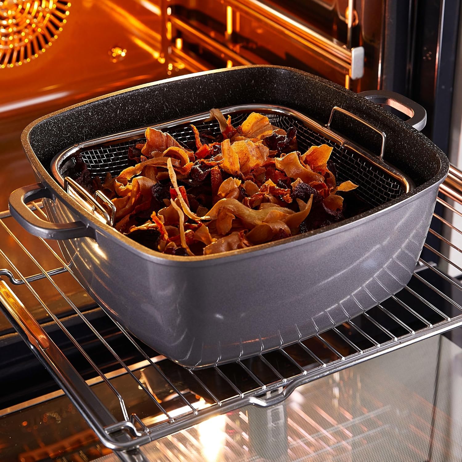 STONELINE - the original! Cook and fry healthy without fat! This 28 cm casserole dish is versatile and can be used quickly and easily as a rotisserie, serving pan, grill pan, casserole, steam pots, fryer and more. Thanks to the angular shape, there is an additional 30% roasting surface compared to round trays. This square casserole dish is a must-have for any home. Lid The unique aromatic glass lid allows for the metered addition of liquids such as B. Wine, liquid spices or other essences through the lid knob. In this way, your refined dishes obtain the unmistakable flavor of the added aromas. The silicone edge of the lid rests directly on the edge of the cookware. This saves energy and there is no noise when cooking. In addition, the silicone rim protects the surface of the pot and makes the glass lid more sturdy. The cast aluminum lid is also induction compatible and can be used separately as a saucepan, serving casserole or hot plate. Steamer You can prepare your food with special care with the steamer. Whether it's vegetables, fish or meat, even sweet dishes like yeast meatballs or steamed noodles are easy and tasty. Thanks to the numerous air holes inside the steamer, the hot steam can be freely distributed around the food and cook evenly. In this way, most of the nutrients and flavors are retained. Fryer This casserole can also be used as a fryer: prepare quick and tasty snacks with the included frying basket! The casserole is oven safe up to 220°C, and the cast aluminum lid can be easily removed from the oven thanks to the supplied heat protectors on the handles. Thanks to the special non-stick coating STONELINE, your dishes can be prepared with or without fat and frying oil, according to your needs, and removed from the cookware without sticking. No matter whether you cook on ceramic hob, induction, electricity or gas. No stubborn residue sticks to cookware with the original STONELINE coating this saves you time and effort. 1 square container, approx. 28 x 28 cm, height: approx. 12 cm, approx. 6.9 litres, 1 lid made of cast aluminium, approx. 28 x 28 cm, height: approx. 4.5 cm, approx. 2.9 litres, 1 x aromatic glass lid with silicone rim, approx. 28 x 28 cm, 1 x steamer insert, approx. 9.4 x 24 cm 1 frying basket, approx. 24 x 24 cm 2 x handle thermal protectors