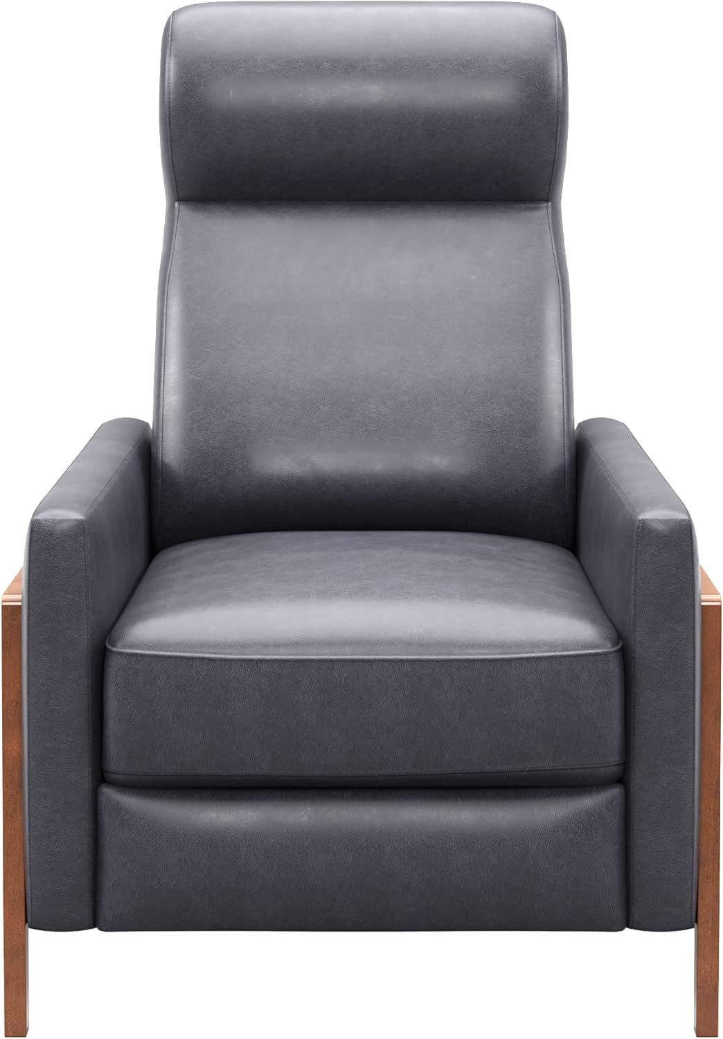 Update your home with the Edge mid-century modern reclining chair. Keep that clean contemporary look you love then relax and unwind in full recline on the built-in pillow top. Tension adjusters allow you to tailor the pressure of the back to personalize the comfort and ease the pushback operation. Top grain leather wherever your body touches with contrasting walnut wood side panels for a chic retro vibe. Solid construction with a hardwood frame assures this accent chair will withstand the test of time.