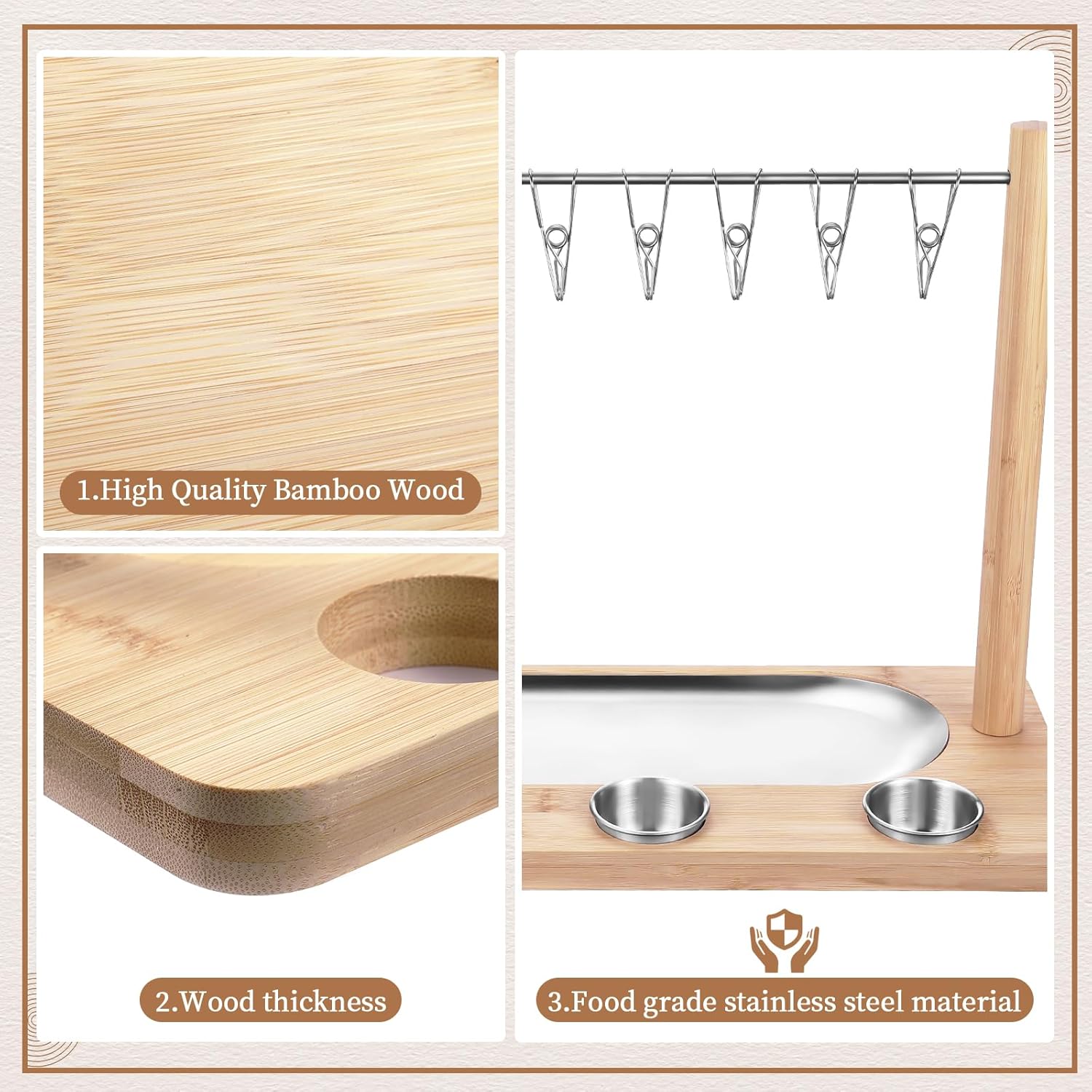 Versatile Bacon Display Hanger: Our multi-functional bamboo cheese board combines a charcuterie board, cheese platter, and bacon hangers in one. Our product stands out with a unique 304 stainless steel tray and three dipping bowls—features not available with other products. These removable accessories make cleaning easier and more convenient. It effortlessly displays a variety of meats, cheeses, fruits, and nuts, catering to diverse tastes and preferences. Ideal for both casual and formal events