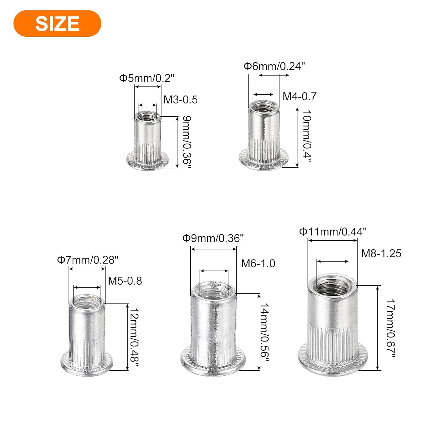 Description:1. [Materials]: Rivet nuts are constructed from aluminum alloy with uniform wall thickness, treated surfaces for corrosion resistance, and enhanced strength.2. [Features]: Our rivet nuts feature knurls with flat, deep threads for easy installation and slip resistance. Rivet nuts are fasteners used to join thin materials that cannot be threaded. They can be installed using a tool that distort the nut, creating a secure connection around the hole.3. [Easy to use]: Rivet nuts require riveting tools, either pneumatic or manual. Create a hole matching the rivet nut's mounting hole size, insert the rivet nut, and use the riveting tool to secure the locking nut.4. [Application]: Rivet nuts are commonly used in metal fabrication industries, including metal sheets and pipes.Specification:Material: Carbon steelHead Diameter: 8mm/0.32inch, 9mm/0.36inch, 10mm/0.4inch, 12mm/0.48inch, 14mm/0.56inchBody Diameter: 5mm/0.2inch, 6mm/0.24inch, 7mm/0.28inch, 9mm/0.36inch, 11mm/0.44inchBody Length: 9mm/0.36inch, 10mm/0.4inch, 12mm/0.48inch, 14mm/0.56inch, 17mm/0.67inchHead Height: 0.8mm/0.04inch, 0.8mm/0.04inch, 1mm/0.04inch, 1.5mm/0.06inch, 1.5mm/0.06inchDrill Hole Size: 5mm/0.2inch, 6mm/0.24inch, 7mm/0.28inch, 9mm/0.36inch, 11mm/0.44inchPackage Content: 25pcs x M3-0.520pcs x M4-0.715pcs x M5-0.810pcs x M6-1.05pcs x M8-1.25