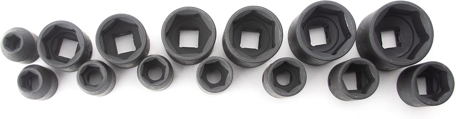 28pc 1/2" Dr. Air Impact Socket (METRIC) & (SAE) Metric sizes: 11, 12, 13, 14, 15, 17, 18, 19, 21, 22, 24, 27, 30, 32mm SAE Sizes: 3/8, 7/16, 1/2", 9/16", 5/8", 11/16", 3/4", 13/16", 7/8", 15/16", 1", 1 1/16, 1 1/8, 1 1/4" Heat Treated Drop Forged CrV High Quality Steel Comes in nice lockable blow molded case for easy storage Set Includes: 28 Impact Sockets and 2 Cases