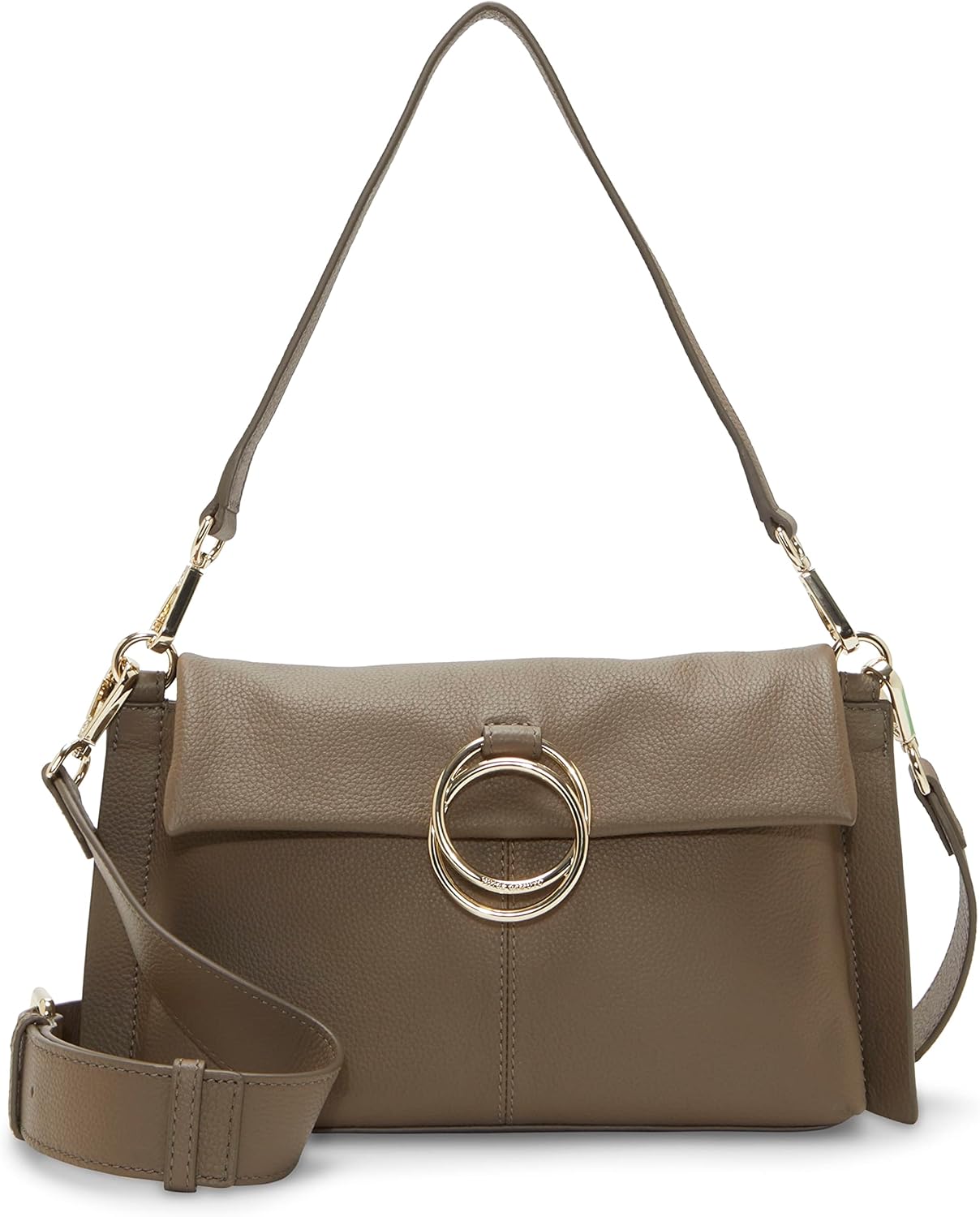 Metal ring accents offer a contemporary vibe to the Livy shoulder bag from Vince Camuto. Smooth leather and clean lines define the silhouette for your new favorite handbag. Features an adjustable crossbody strap and short shoulder strap for versatility.
