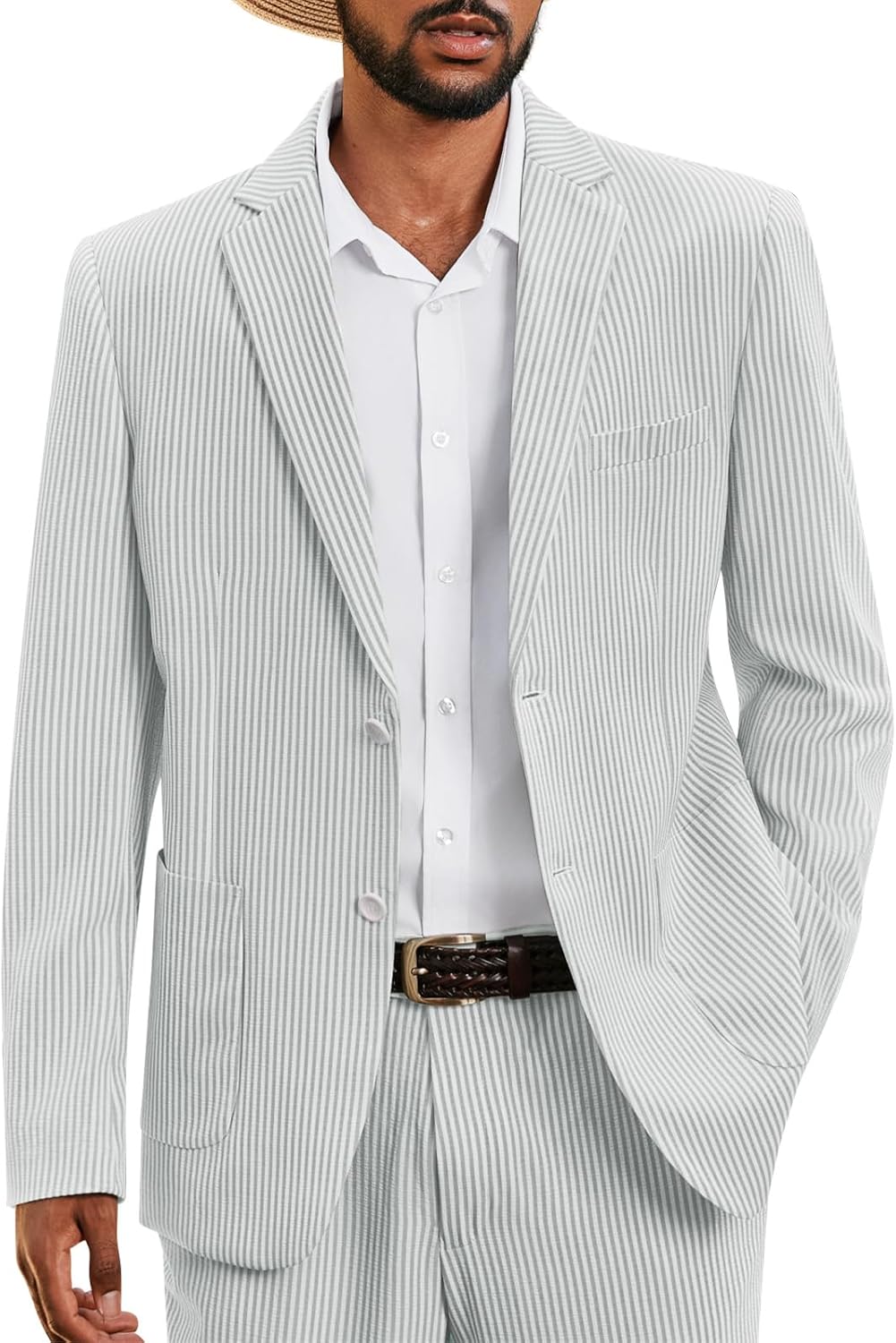 The WEEN CHARM men’s suit is a stylish 2 piece suit set designed for modern occasions. This slim fit suit includes a tailored blazer and matching pants made from lightweight seersucker fabric with classic stripes. The breathable material makes it an excellent summer suit for weddings beach parties and outdoor events.The suit jacket features a two button closure notch lapel single vent and multiple functional pockets delivering a polished yet comfortable wearing experience. The adjustable waistband on the suit pants ensures a better fit for different body types.Perfect as a wedding suit for men prom suit party suit or formal suit this versatile design fits grooms groomsmen and guests alike. Whether attending a wedding ceremony prom night awards event or party every man deserves a well fitted suit that combines comfort and confidence.