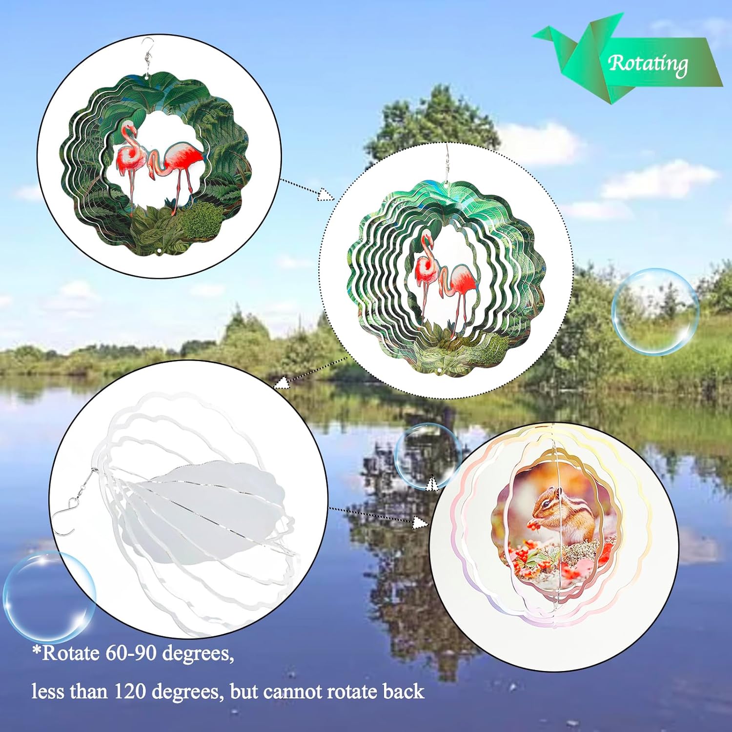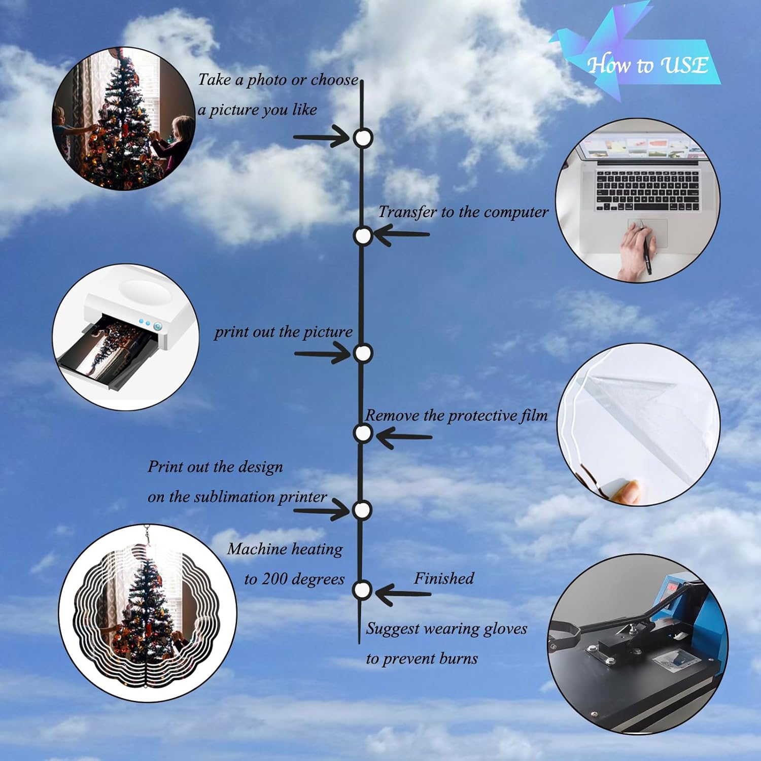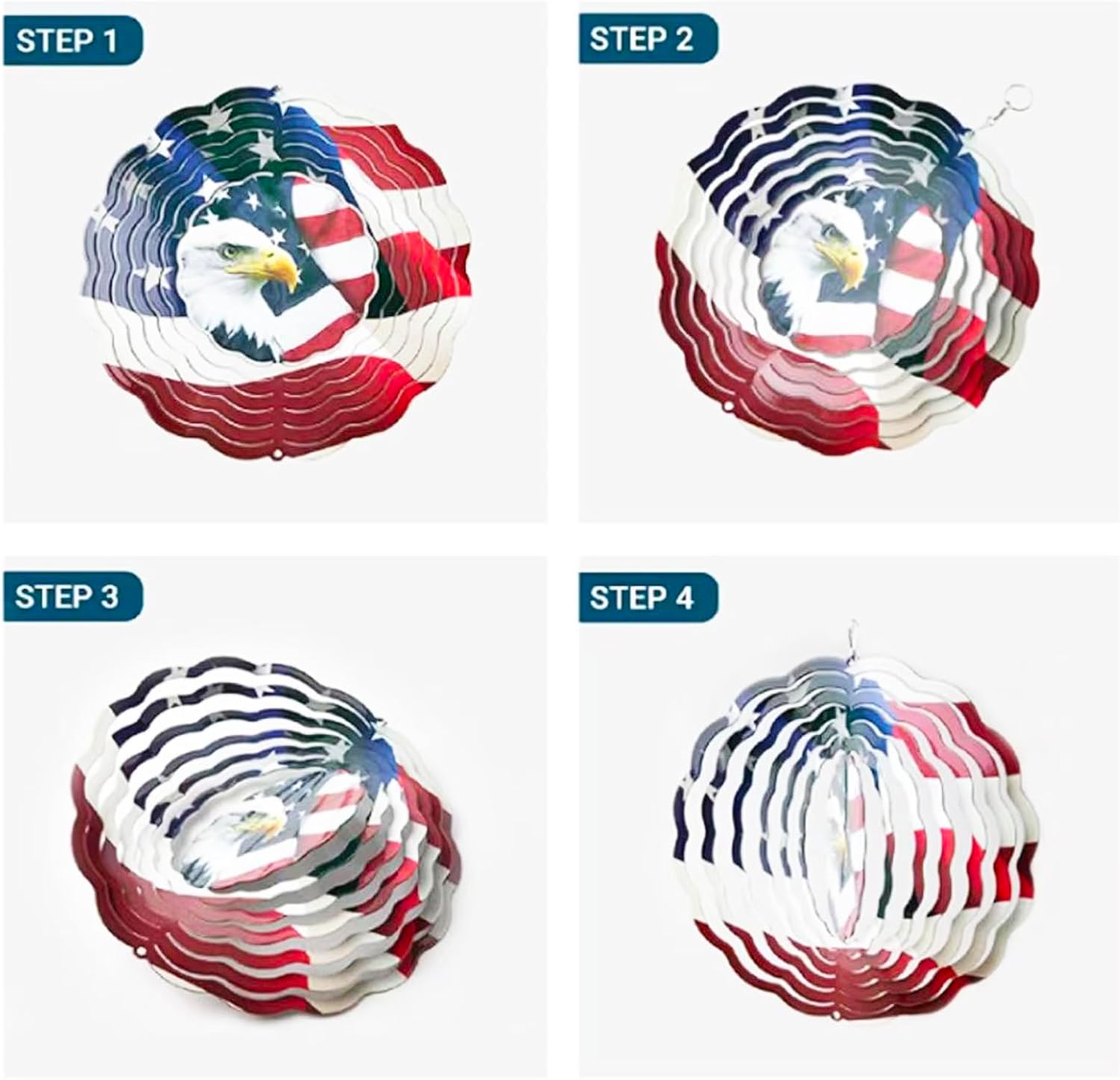 There are 2 pack,4 pack,6 pack of 10 inches Aluminum Sublimation Wind Spinner Blanks. You can choose a picture that you like to print on the wind spinner by sublimation printer and accessory your room,yard and more place.Now just enjoy your DIY time! And the wind spinners outdoor hanging is easy to use.At first,taking out the flat wind spinner from the packge;Secondly left hand hold the front of the wind spinner,right hand hold the back of it.Then left hand press down,mean-while right hand push up,please twist the layers evently.Next right hand hold the wind spinner firmly,use left hand hold the inside part and twist 20-90 degree then release.
