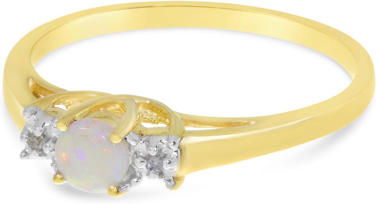 This 10k yellow gold round opal and diamond ring features a 4 mm genuine natural opal with a 0.09 ct total weight.