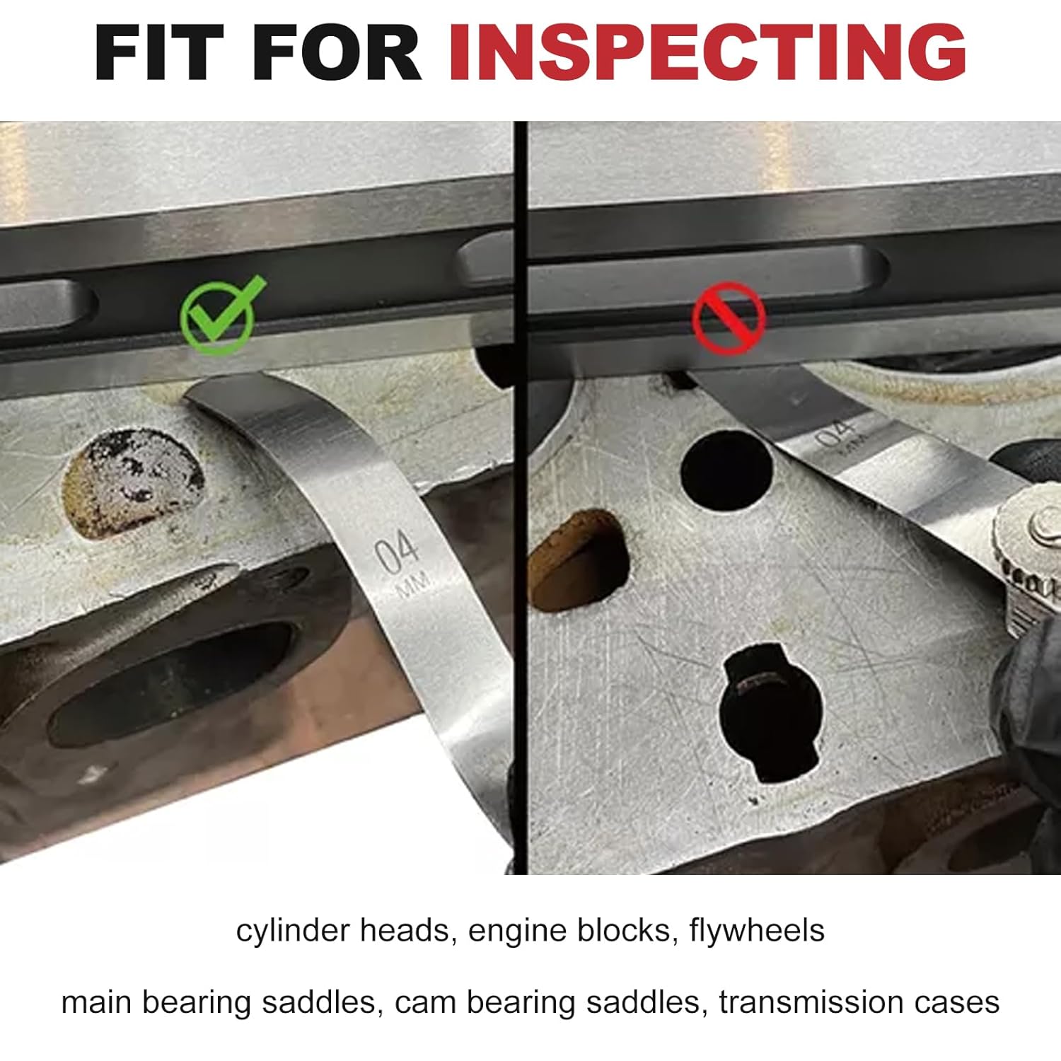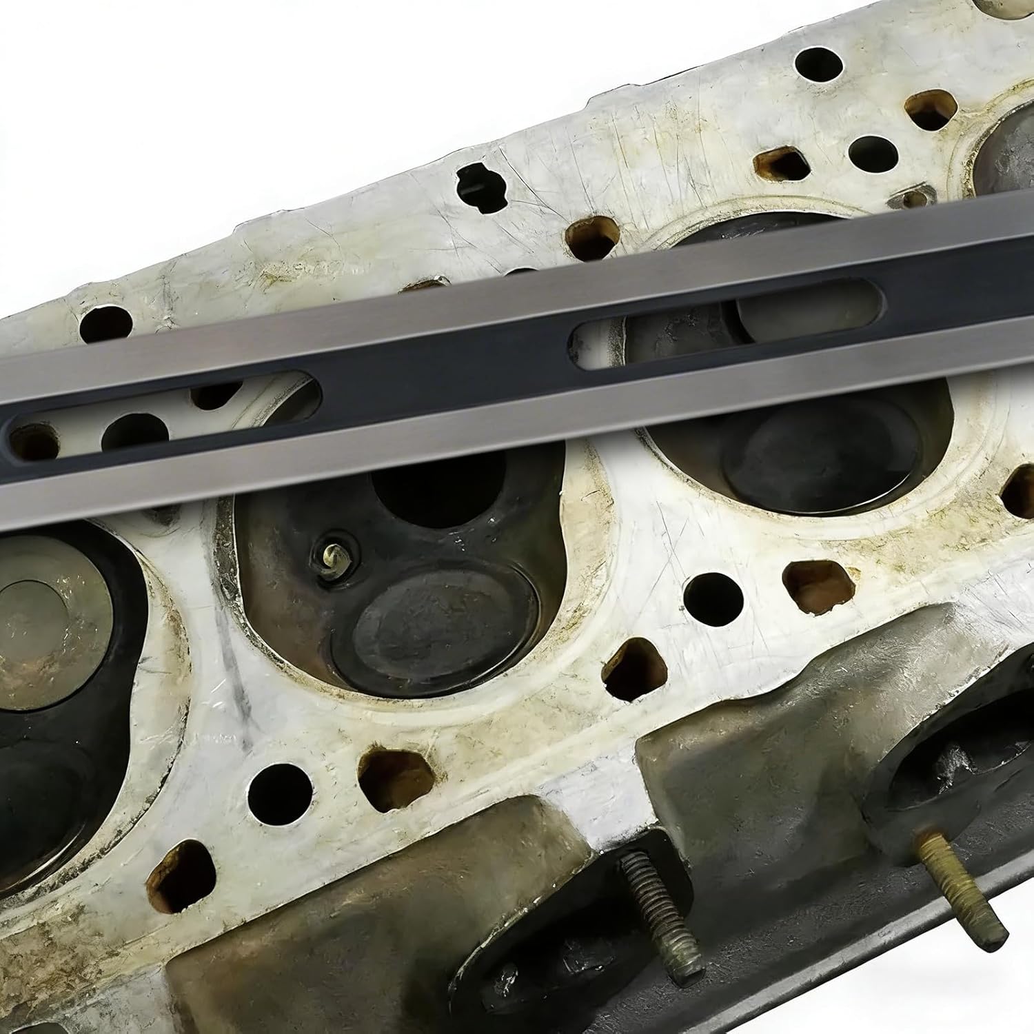 Applications:Engine Rebuilding: Check for warpage on cylinder heads and engine blocks before machining or assembly.Transmission & Drivetrain: Inspect flywheel flatness, bell housing alignment, and case surfaces.General Machining: Verify the flatness of machine ways, surface plates, and other critical reference surfaces.Industrial Maintenance: Assess the planarity of various equipment beds and frames.Best Results:Clean the surface of the part (e.g., cylinder head deck) and the straight edge thoroughly.Place the steel straight edge diagonally, vertically, and horizontally across the surface.Use a set of feeler gauges (not included) to check for gaps between the straight edge and the surface.Any gap that accepts a feeler gauge beyond the specified service limit indicates warpage requiring machining.Technical Specifications:Length: 24.0 InchesWidth: 1.5 InchesThickness: 0.7 InchesMaterial: Heat-Treated S50C Carbon SteelAccuracy: ±0.001 Inch (±0.025 mm)