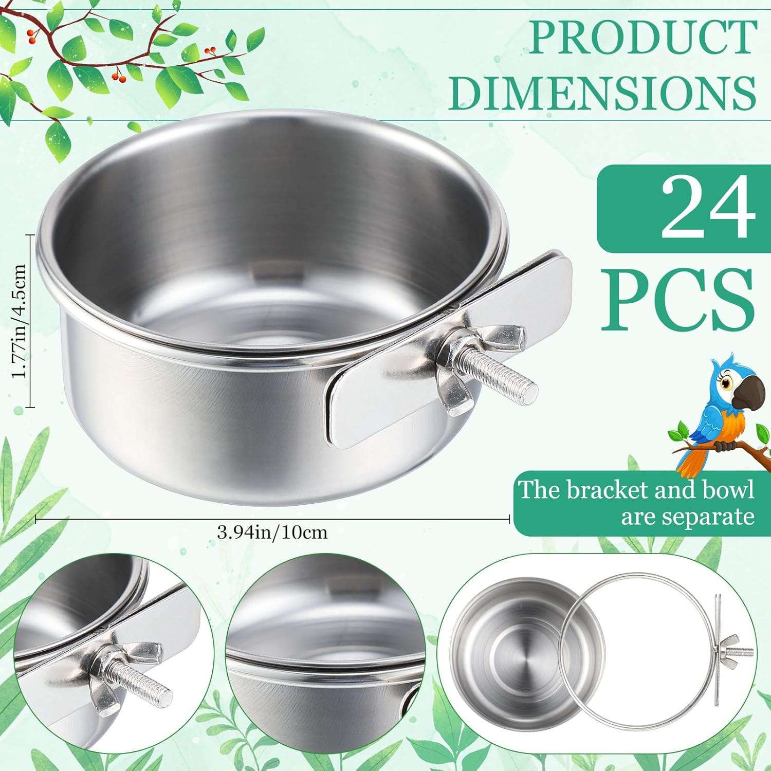 Features: The parakeet food dish is not only ideal for regular feeding but is also versatile enough to use for water and treat storage. With a capacity of approximately 10 oz, it ensures your birds are healthier and happier, getting the right amount of food and water they need. The parakeet feeder will be a thoughtful and useful gift for bird owners, family, relatives, neighbors or friends, provides their pets with a pleasant feeding experience. Specifications: Material: stainless steel Color: silver Size: about 3.9 inches/ 10 cm in diameter, 1.8 inches/ 4.5 cm in height Capacity: about 10 oz Package includes: 24 x Stainless Steel Bird Feeding Dish Cups Notes: Manual measurement, please allow slight errors on size. The color may exist a slight difference due to different screen displays.
