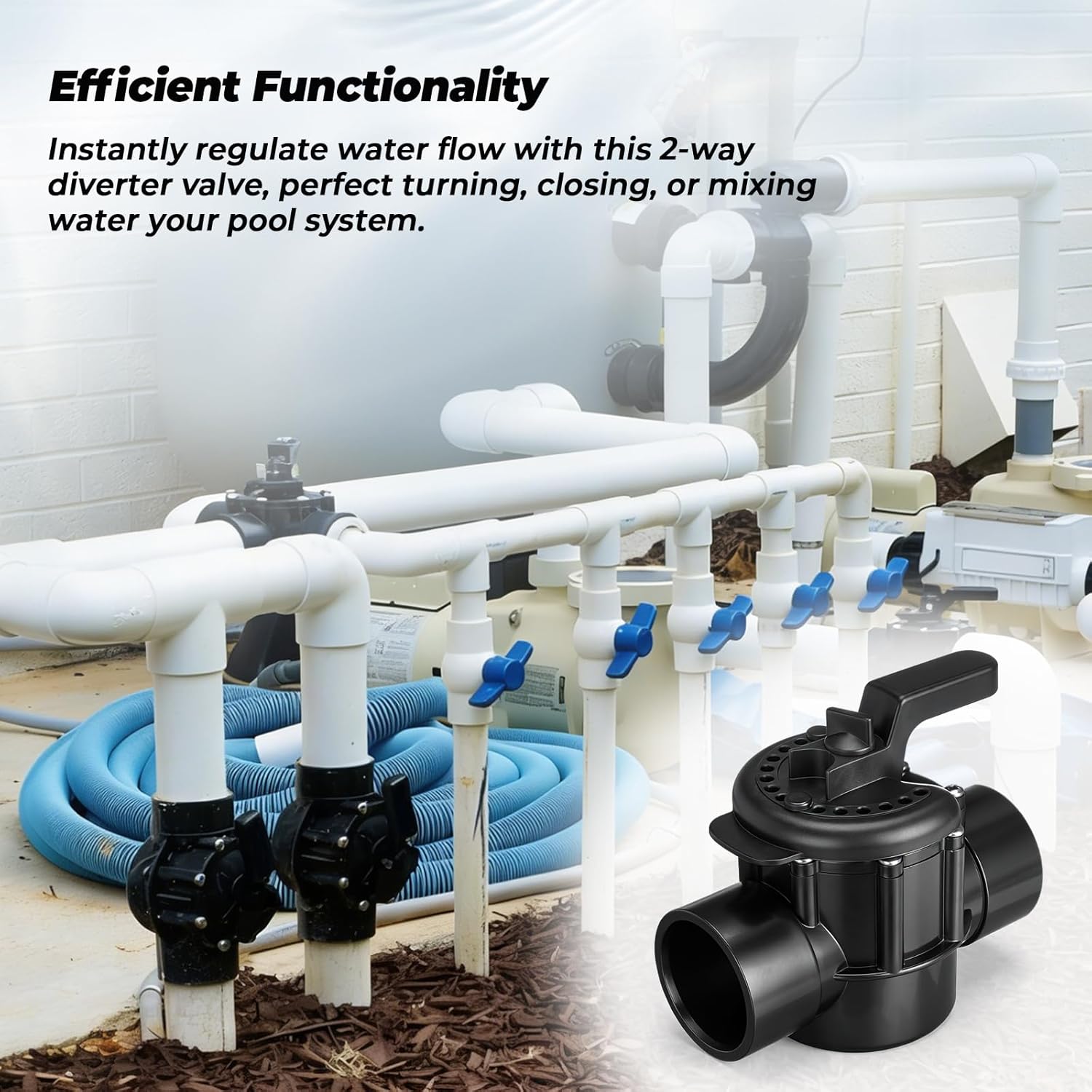 Feature: This 1-1/2-inch 2-way PVC diverter valve is engineered for residential and commercial water circulation systems, with primary focus on pool, spa, and water feature plumbing. Specifications: Color: Black Material: PVC and CPVC Number of Ports: 2 Inlet Connection Size: 0.5 Inches Outlet Connection Size: 1.5 Inches Package Dimensions: 5.9 x 5.9 x 3.94 Inches / 9.45 x 5.9 x 5.9 Inches Item Weight: 1.1 Pounds / 2.2 Pounds Package Include: 1 x 2 Port PVC Diverter Valves or 2 x 2 Port PVC Diverter Valves