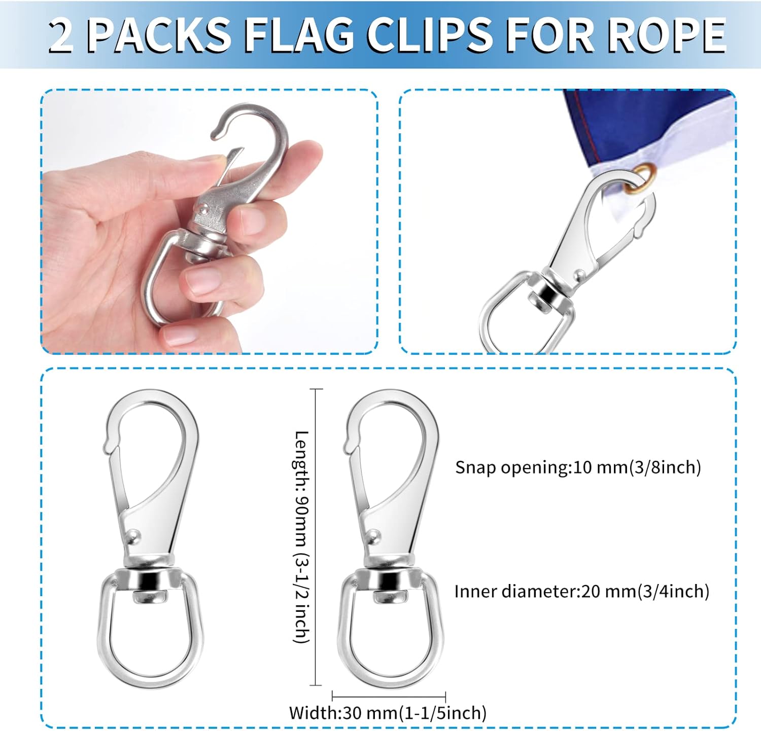 Features: Application: Strong and durable, can be applied as flag pole line, clothes rope, anchor lines, halyard rope, starter cords, tie downs, camping, etc. Convenient combination the wire center flagpole ropes with 2 pieces snap hooks which are nice combination for your use, the snap hooks will bring your much convenience during the process to hanging your flags. Specifications: Color: white material: polyester and stainless steel Package contents: 1 x 100ft wire center flagpole rope 2 x stainless steel snap hooks Note: Please do not use the rope and hooks for dangerous purposes such as rock climbing and mountaineering. Manual measurement, please allow slight size errors. Winding risk may exist, please keep it away from kids under 3 years old