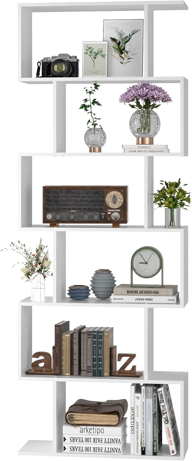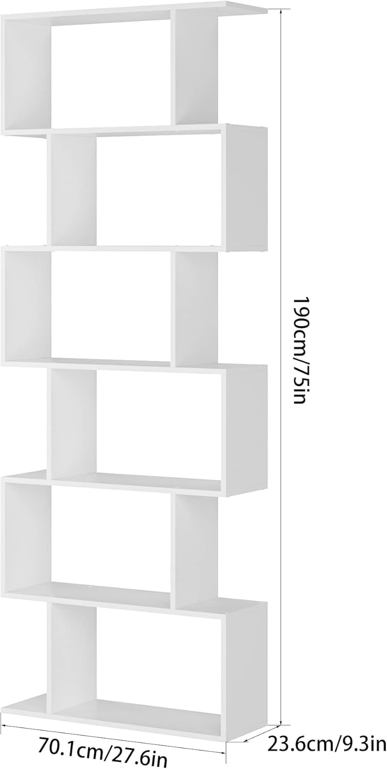 Description: The stylish lines and unique design of this modern S shaped bookshelf with Z-shelf style make it a great additional to all style of room and any furniture, matches most decor themes. With elegant appearance, it is not only a good storage shelf organizer, but also an attractive decoration to your house. This tall white bookshelf is suitable for your living room, bed room, office, corridor, kitchen and so on. Features: Sturdy & Safe Geometric bookshelf with anti-toppling fittings for a better stability, durability and resistance. Function Meets Design Space-saving modular design of this S Shaped Bookcase allows for larger storage space. Pair with another shelf to divide the room and create a private space for yourself. Easy to install All the screws and parts are labeled and detailed instructions included, this quality occasional open geometric bookcase is easy to put together. Specifications: -Material: Chipboard -Color: White -Overall Size: 74.8x 27.6x 9.3inch(190.5x 70x 23.5cm) -Weight: 44lbs(20kg) -Assemble Required: Yes Package Include: -1x white bookshelf -1x instruction - 24h Customer support