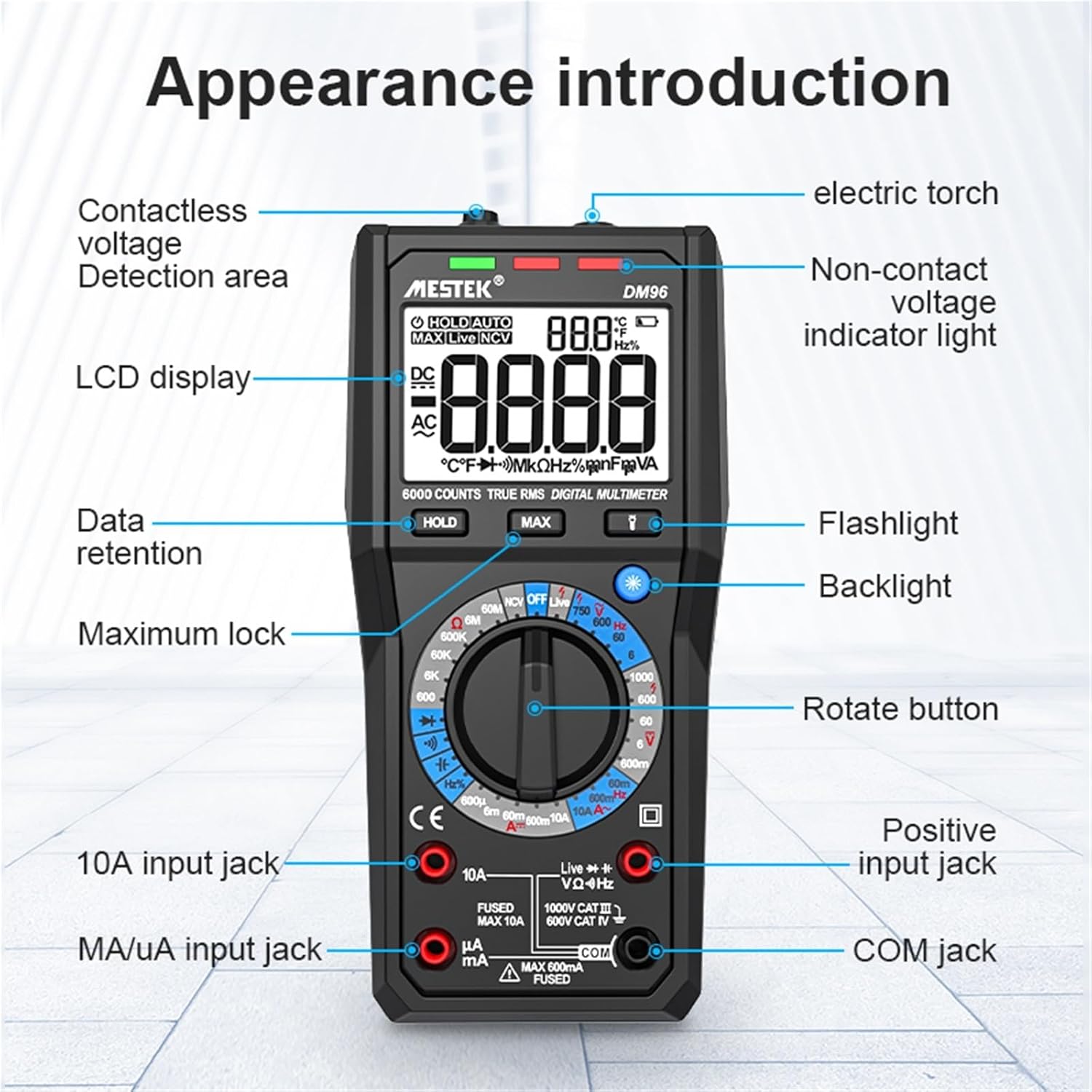 Multi TestersModel Number : DM96Place of Origin : Guangdong, ChinaApplication : Household UseDimensions : 184*88*50mmFeature : otherLow Battery Indicator : YesMaterial : OTHERMax. AC Current : 10AMax. AC Voltage : 750vMax. DC Current : 10AMax. DC Voltage : 1000 VMeasuring Capacitance Range : multimeter digitalMeasuring Inductance Range : multimeter digitalMeasuring Resistance Range : 0-60MOperating Temperature : -20~1000Power Supply : 2*1.5V AAColor : Blacksize : 184*88*50mmsampling time : about 15minutesDisplay : 6000 CountsAC voltage (V) : 750VDC voltage (V) : 1000VAC current (A) : 10ADC current (A) : 10A
