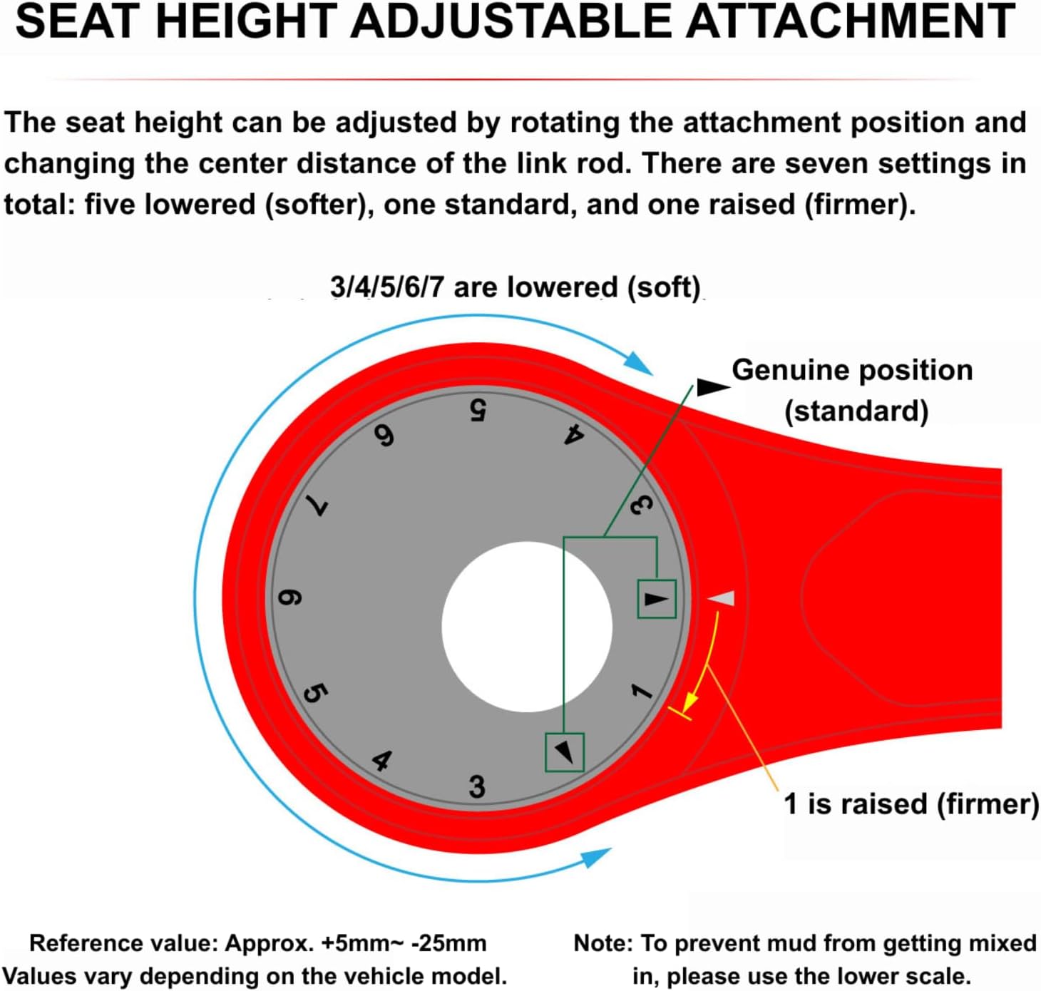 Height Adjustable: Provides 7 settings, from +2mm lift to -27mm drop, allowing riders to fine-tune seat height and suspension feel. Custom Suspension Tuning: Adjusting the link rod length changes the link ratio, making the rear suspension softer when lowered or firmer when lifted. Precision Construction: CNC-machined from 7000-series aluminum alloy with a durable red anodized finish. Bolt-On Installation: Comes pre-assembled with high-quality bearings and dust seals, ready to replace the stock link rod. Versatile Setup: Ideal for adjusting ride comfort and performance to match rider preference or course conditions. Compatible with Yamaha WR250R (2007-2017) WR250X (2007-2017)