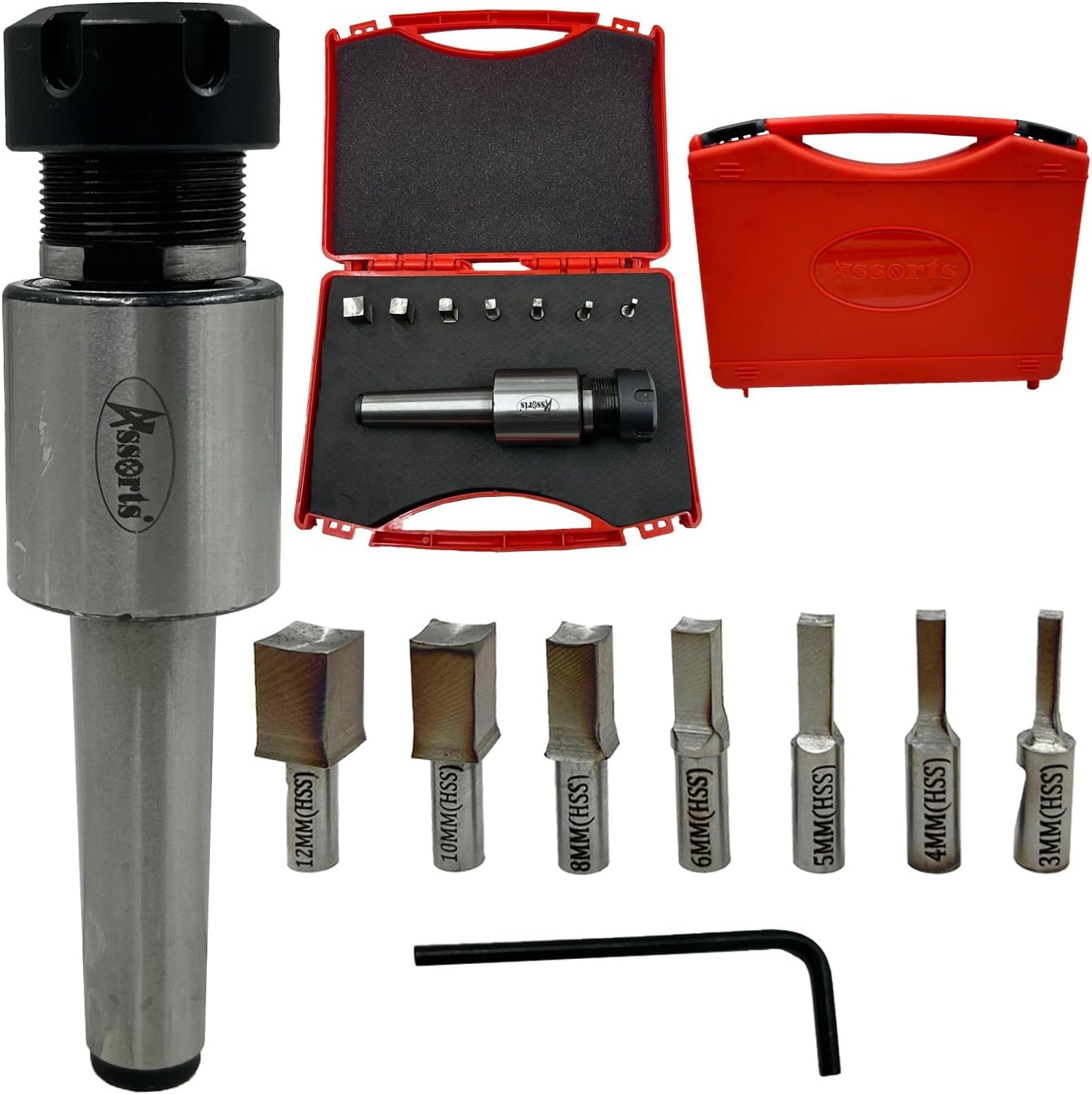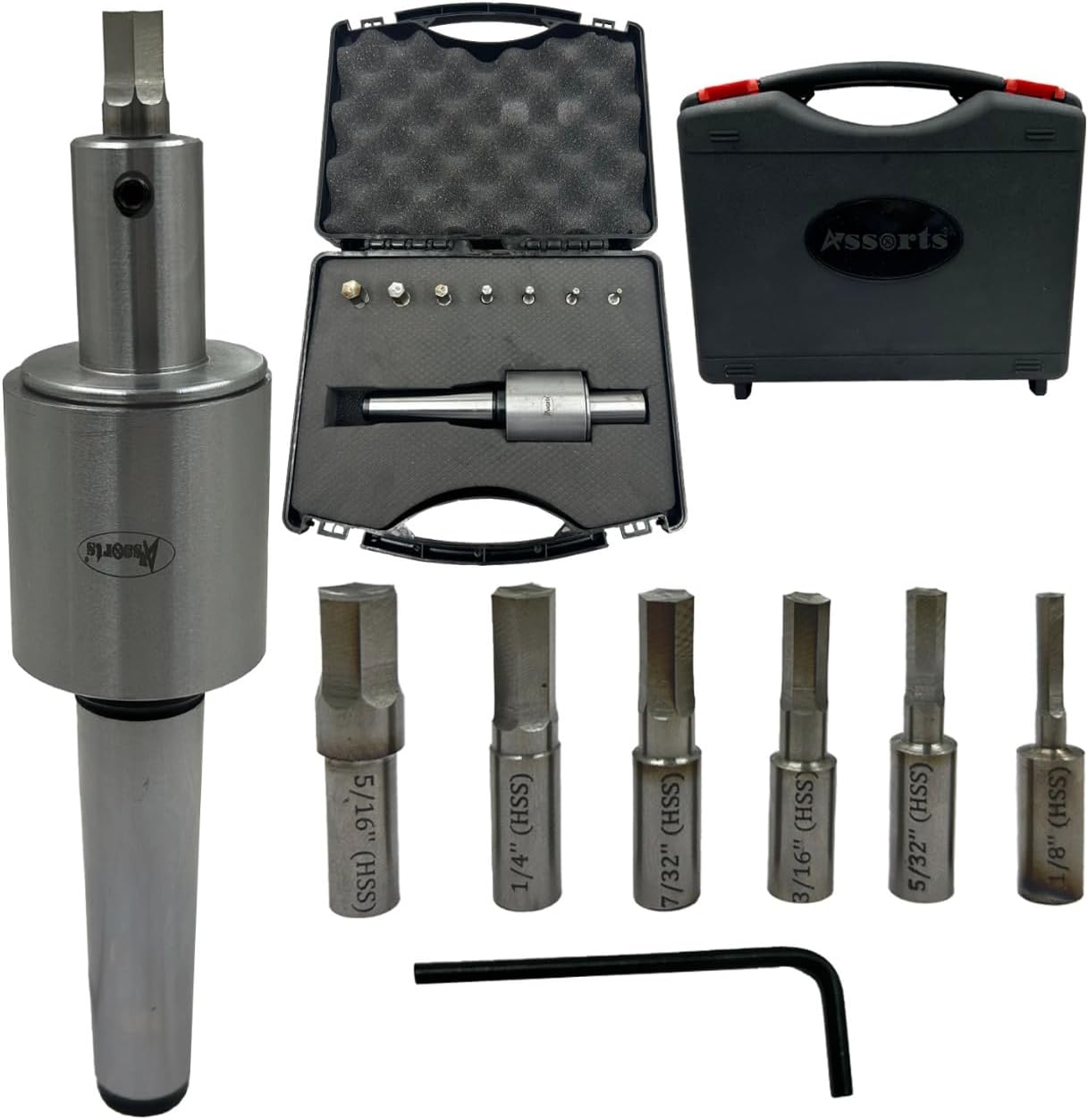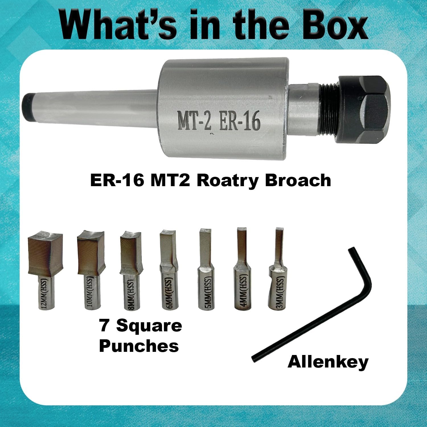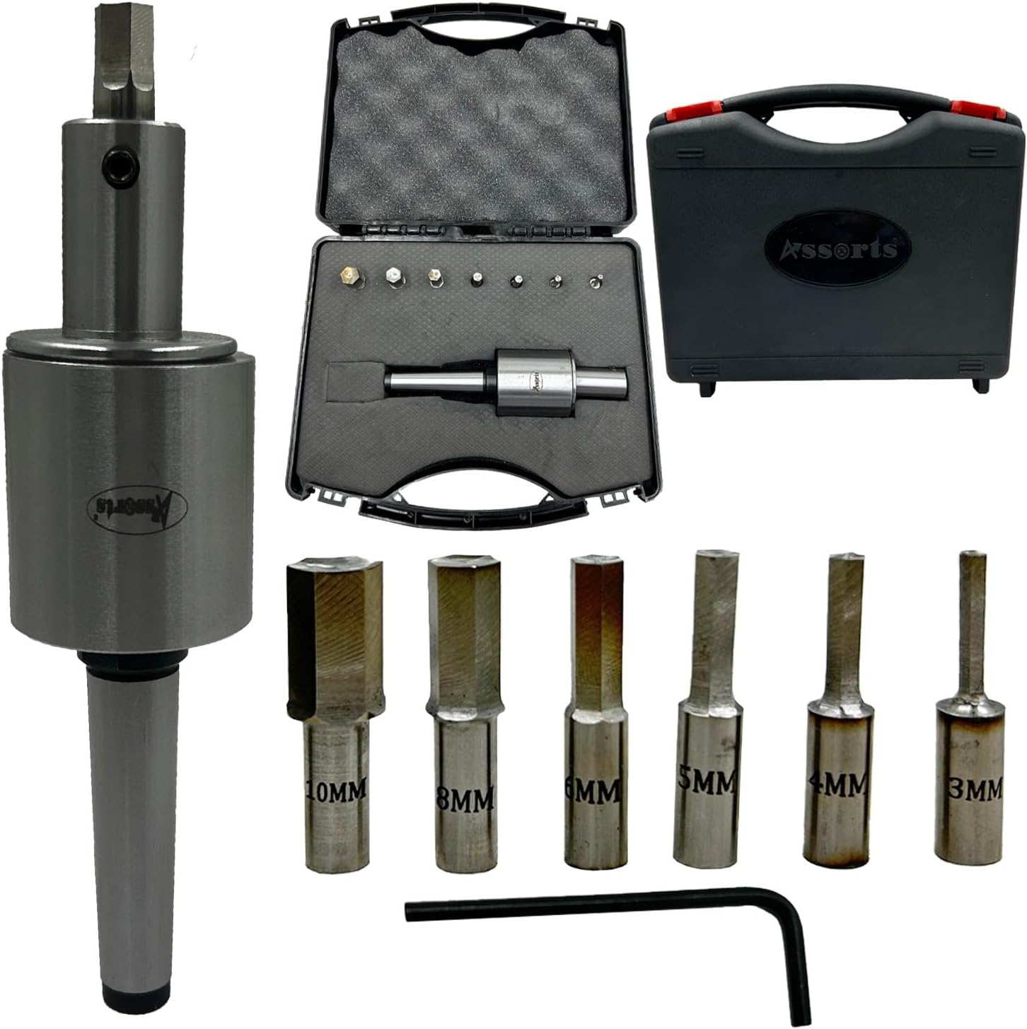 The Assorts ER-16 MT2 Rotary Broach Set Is Engineered For Machinists And Workshop Professionals Seeking Precision, Durability, And Efficient Performance When Producing Internal Square Profiles. This Rotary Broach Holder Features A Morse Taper 2 (MT2) Shank And An ER-16 Threaded Head, Making It Compatible With A Wide Range Of Lathes, Milling Machines, And CNC Equipment. This Complete Broaching Kit Includes Seven Metric Square Broach Punches—12mm, 10mm, 8mm, 6mm, 5mm, 4mm, And 3mm—all Manufactured From Premium HSS (High Speed Steel). These Punches Deliver Outstanding Wear Resistance, Sharp Cutting Edges, And Consistent Performance, Even During Demanding Metalworking Operations. The Rotary Broach Holder Ensures Smooth, Low-resistance Cutting Action, Allowing Accurate Production Of Square Holes, Keyways, Square Recesses, And Internal Drive Sockets. Its Robust, Industrial-grade Construction Enhances Rigidity And Minimises Tool Vibration, Ensuring Clean And Precise Results. Designed For Toolrooms, Automotive Workshops, Aerospace Machining, Engineering Fabrication, And General Metalworking, This ER-16 MT2 Rotary Broach Set Provides A Dependable, Long-lasting Solution For Internal Broaching Applications. With Assorts’ Reputation For Reliable Precision Tools, This Set Is A Valuable Addition To Any Machining Environment.
