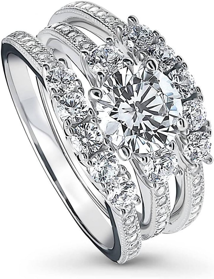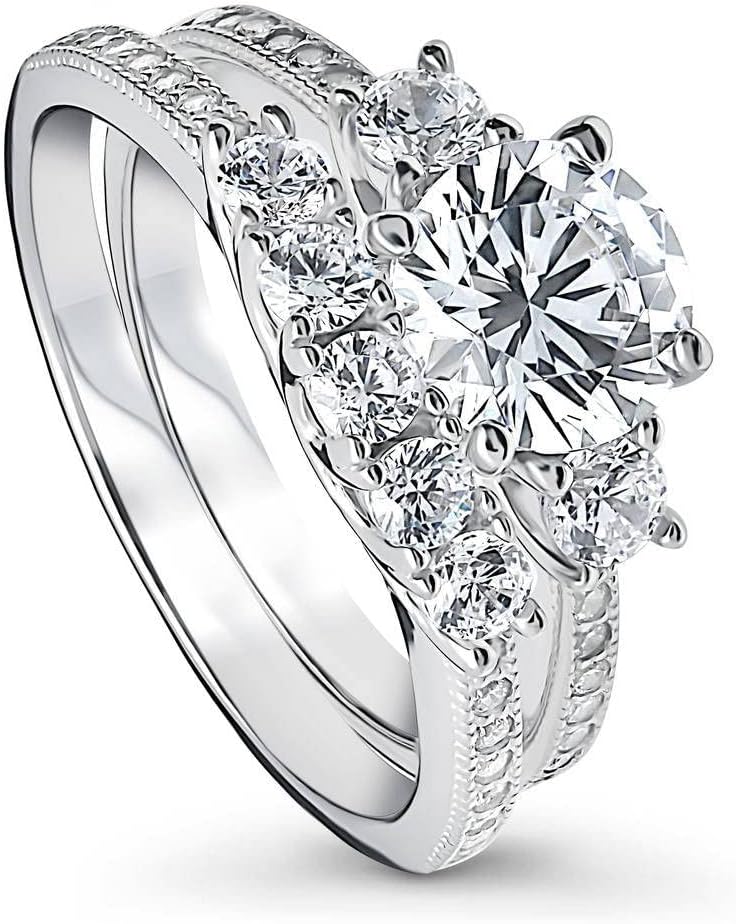 Celebrate special moments with this sterling silver ring featuring a stunning 1.25 carat round cut cubic zirconia. Perfect for weddings, engagements, promises, or anniversaries. The 3-stone and 5-stone designs offer stackable elegance. Crafted with fine 925 sterling silver. Set with premium grade cubic zirconia CZ. Imported.DISCLAIMER: CZ carat weights are approximate and provided as diamond equivalents. Intended for adult women.