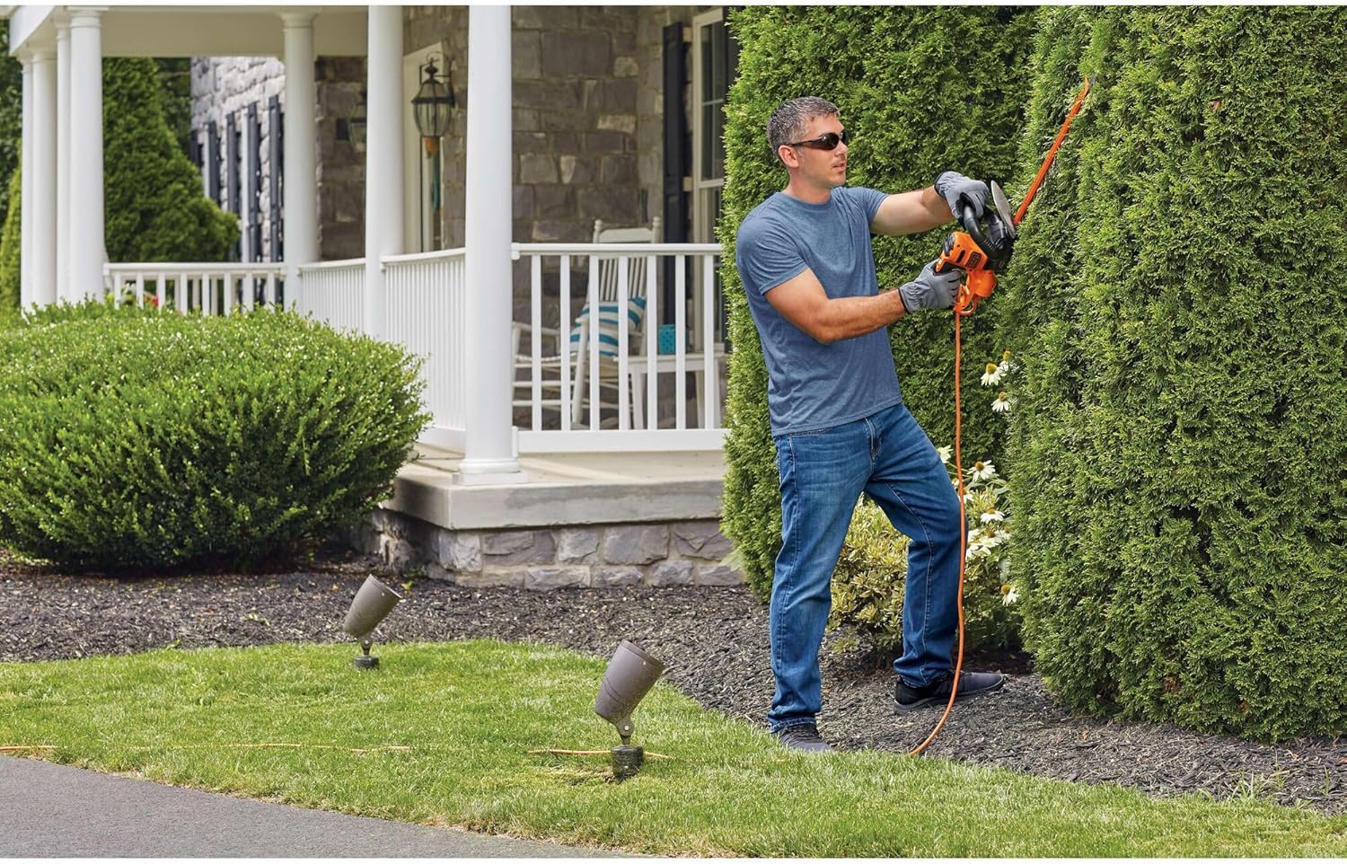 This 20-inch Electric Hedge Trimmer is great for routine trimming of large hedges and shrubs Plus, its SAWBLADE at the end of the blade lets you cut large branches up to 1.5-inch thick. The bush trimmer has a lightweight design and full wrap-around handle. BLACK+DECKER hedge trimmer is designed for greater comfort and control.