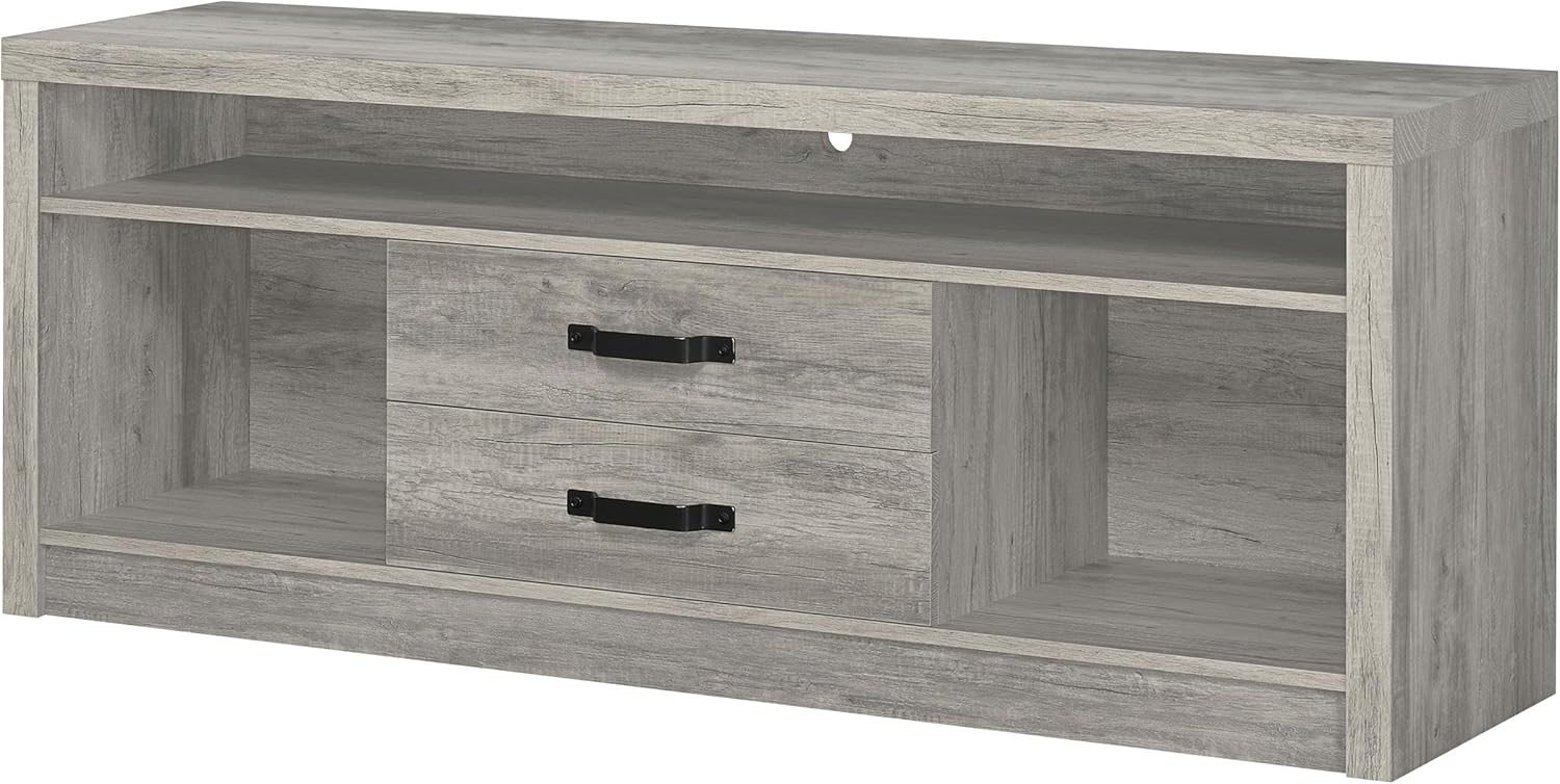 Add modern flair to your living room with this stylish 59-inch TV stand, designed with a sleek transitional design for a timeless appeal. The driftwood finish and engineered wood construction ensure durability, while offering a cozy, rustic touch. It features 2 lower drawers and 2-side compartments, providing ample media storage to keep everything organized. Perfect for any bedroom or living room, this TV console effortlessly blends function with style.