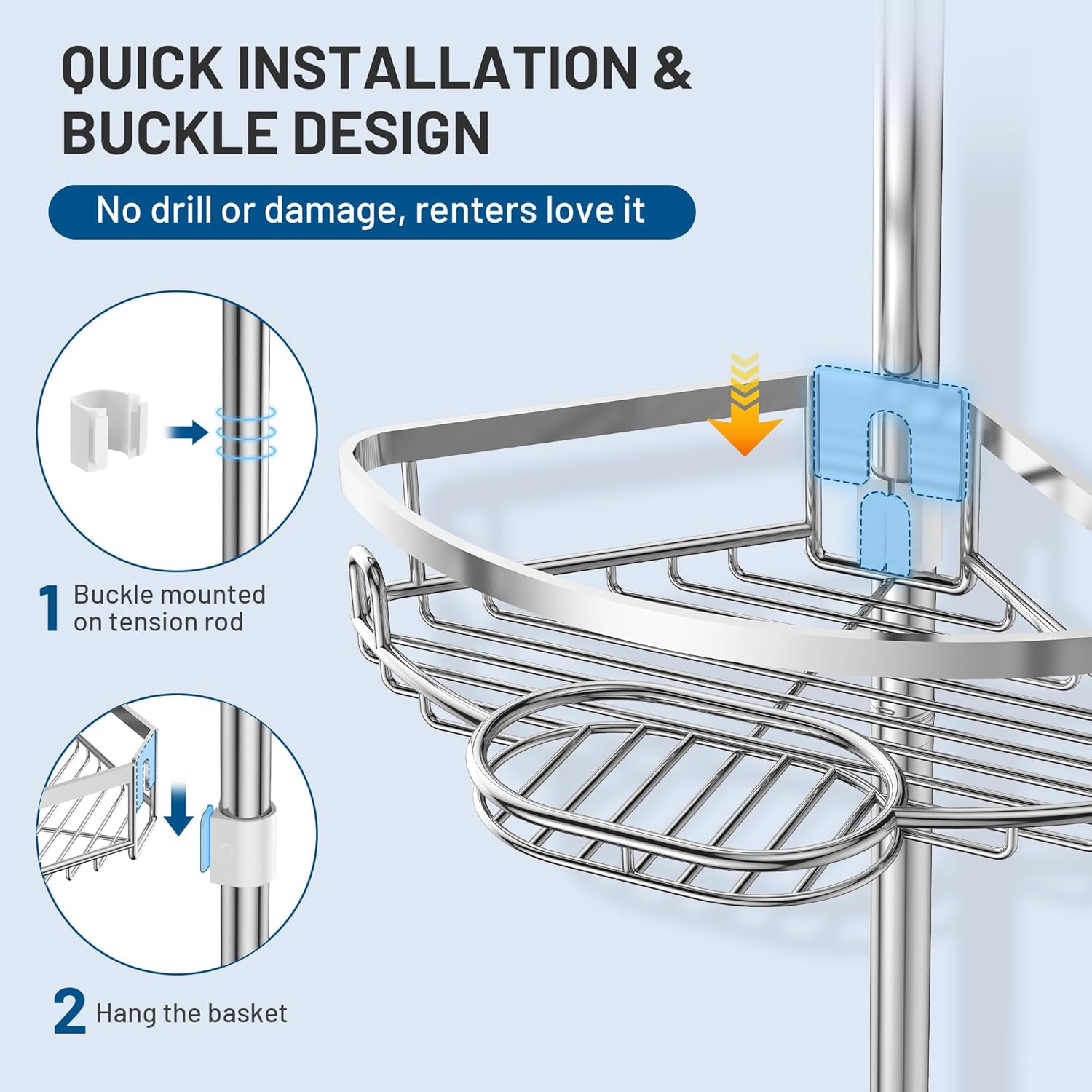 | Assembly Instructions Description | The product comes with an installation manual that provides step-by-step instructions for setting up the shower caddy without the need for tools or drilling. The patented snap design allows for easy adjustment of basket height in just 2 seconds without removing the rod. Follow the instructions to secure the tension pole firmly between the floor and ceiling, ensuring no damage to walls or ceilings. |