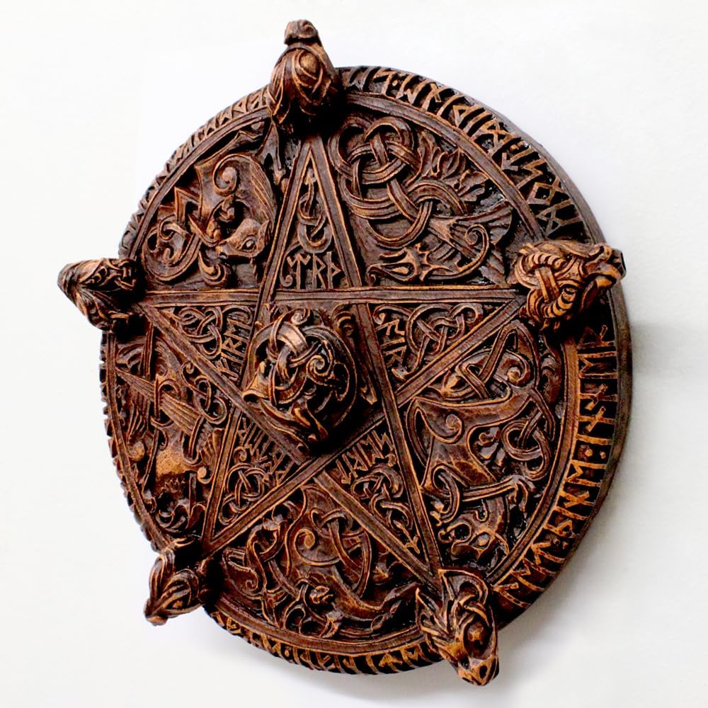 This stunning large Celtic pentacle wall plaque is a beautiful and symbolic piece for any home. Crafted with intricate details, the pentacle itself is depicted in the Anglo-Saxon style, also known as the Seal of Solomon. Within the points of the pentacle, runes from the Elder Futhark spell out "Air, Fire, Water, Earth Spirit," representing the balance of these elements with the divine. The inscription around the edge reads, "Let thine innermost divine self be enfolded in the rapture of the infinite," adding a touch of spiritual inspiration. Look closer to discover the 26 creatures adorning this plaque – a delightful challenge for anyone interested in Celtic symbolism. This plaque is a perfect addition to a Wiccan or Pagan space, or a unique conversation piece for any home decor.
