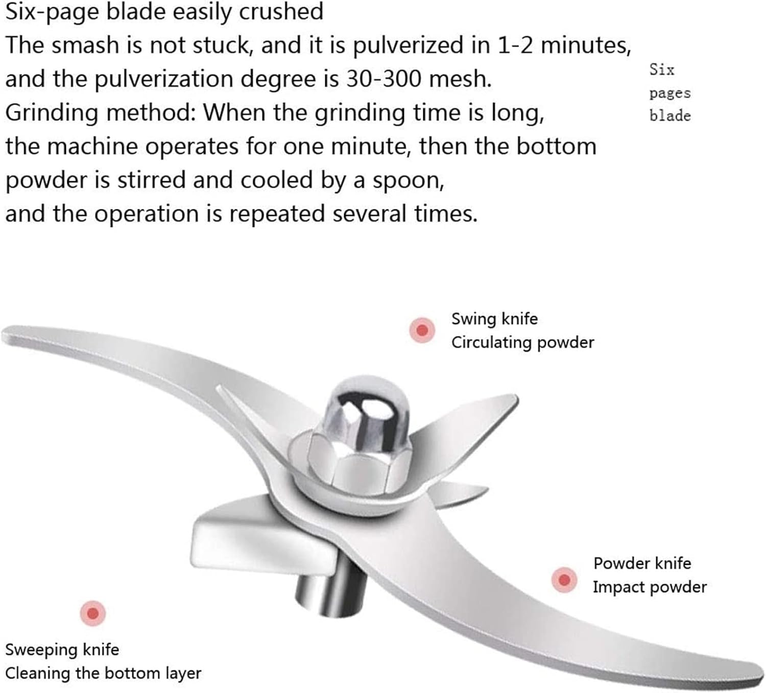 Product capacity: 1500g Material moisture content: dry goods Principle: High-speed universal crusher Maximum material hardness: stone can be turned into powder Product voltage: 220V Product power: 3000W Operation: intermittent use, 30 seconds into powder Smashing bin diameter: 20cm Smashing bin height: 14cm Smashing bin material: food grade stainless steel Application areas: pharmacies, hotels, supermarkets, markets, etc. Production capacity: 15-30 (kg/h) Spindle speed: 35000 (r/min) Feeding granularity: ≤ 90 (mm) Motor power: 3000w (KW) Discharging granularity: 50-300 mesh (mm) Dimensions: 28*28*42cm (m) Weight: 9 (kg)