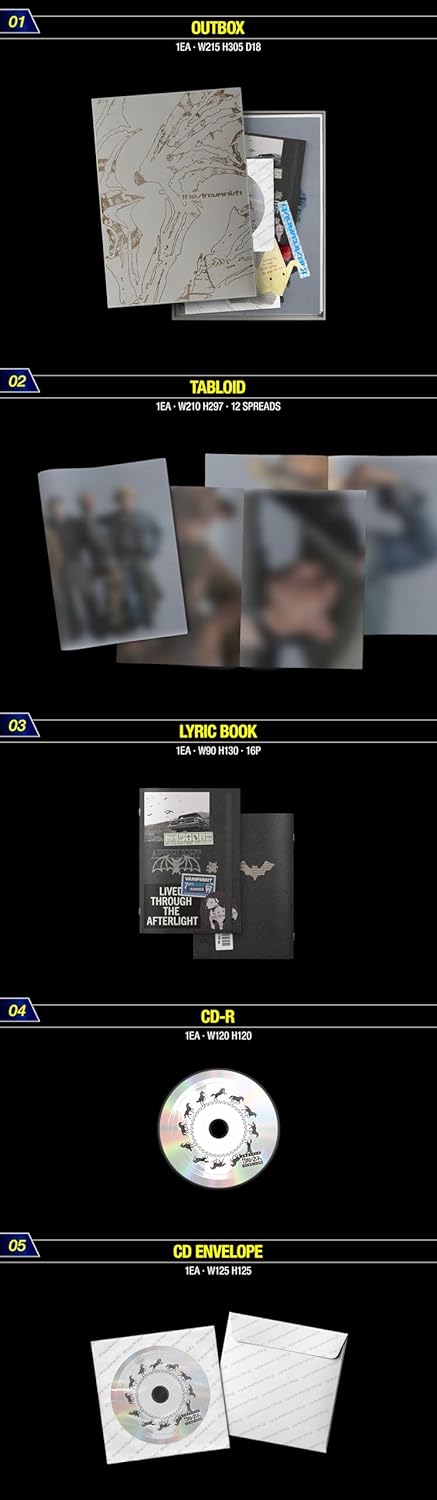 Inclusion Details Out Box 3 versions / 1 type per version / W215 × H305 × D18 mm Tabloid 3 versions / 1 type per version / W210 × H297 mm / 12 spreads Lyric Book 3 versions / 1 type per version / W90 × H130 mm / 16 pages CD-R 3 versions / 1 type per version / W120 × H120 mm CD Envelope 3 versions / 1 type per version / W125 × H125 mm Film Photo A 3 versions / 1 type per version / W100 × H150 mm Film Photo B 3 versions / Random 1 out of 7 types per version / W100 × H150 mm AD Card 3 versions / 1 type per version / W82 × H52 mm Logo Sticker 1 version / 1 type / W140 × H18 mm Sticker Set 3 versions FORBIDDEN Ver. 3 types per set A W40 × H120 mm B W117.5 × H50 mm C W85 × H55 mm AFTERLIGHT Ver. 3 types per set A W48.5 × H119 mm B W93 × H91 mm C W72 × H94 mm STORM Ver. 4 types per set A W82 × H110 mm B W70 × H70 mm C W40 × H40 mm D W40 × H40 mm Flyer 3 versions / 1 type per version / W148 × H210 mm Photo Card A 3 versions / Random 1 out of 7 types per version / W54 × H86 mm Photo Card B 3 versions / Random 1 out of 7 types per version / W54 × H86 mm Instant Photo 1 randomly inserted out of 400 First press only