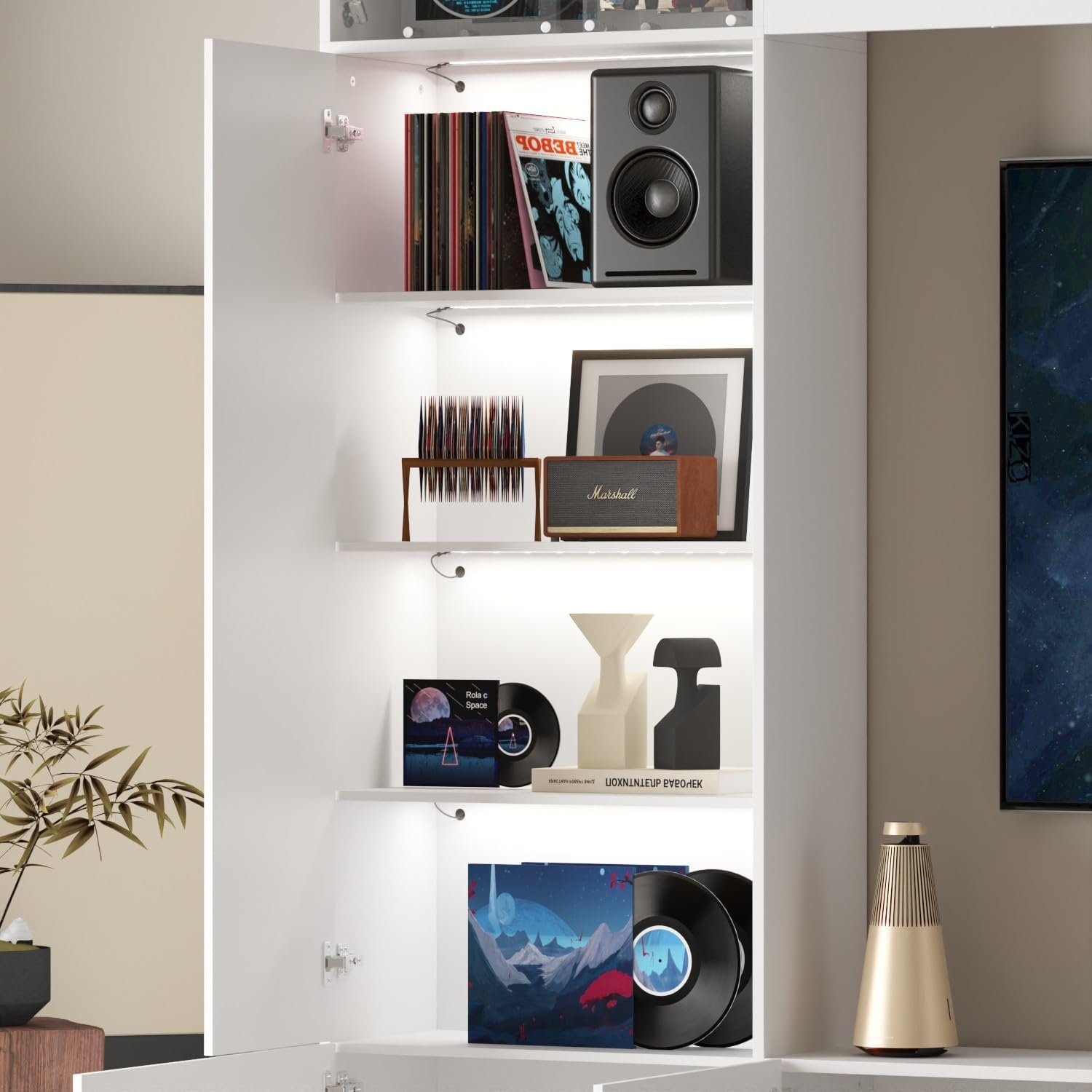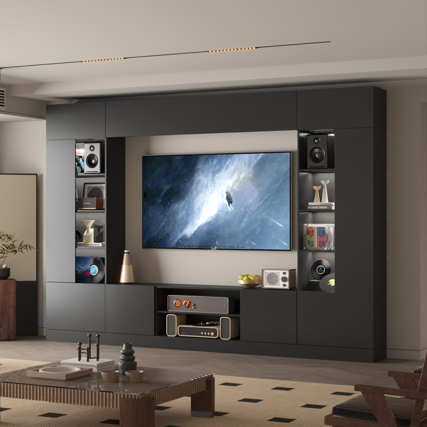 FAMAPY Large Entertainment Center with Light, TV Media Center with Doors and Shelves, TV Hutch for Living Room White 114.2”W x 11.8”D x 78.7”H