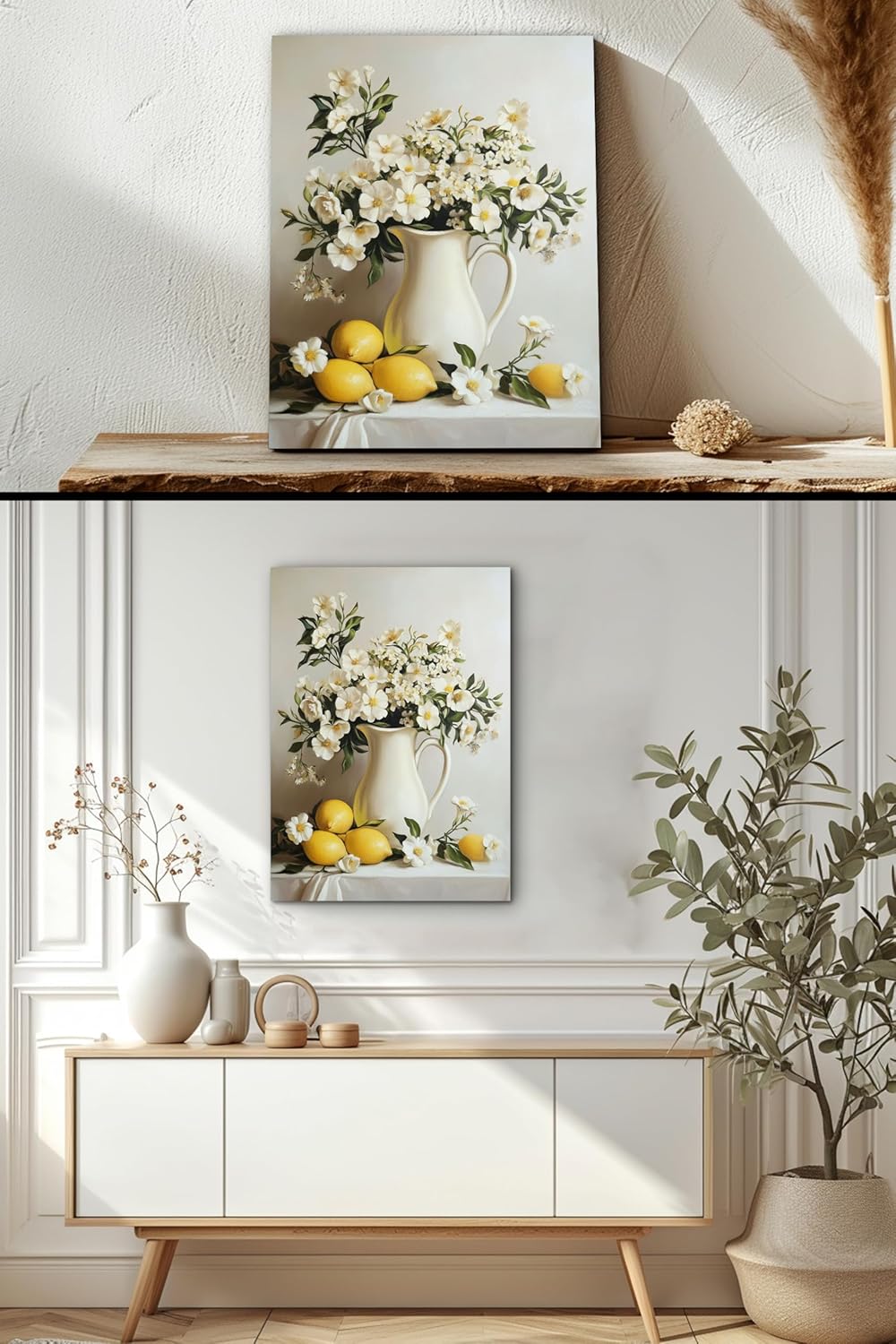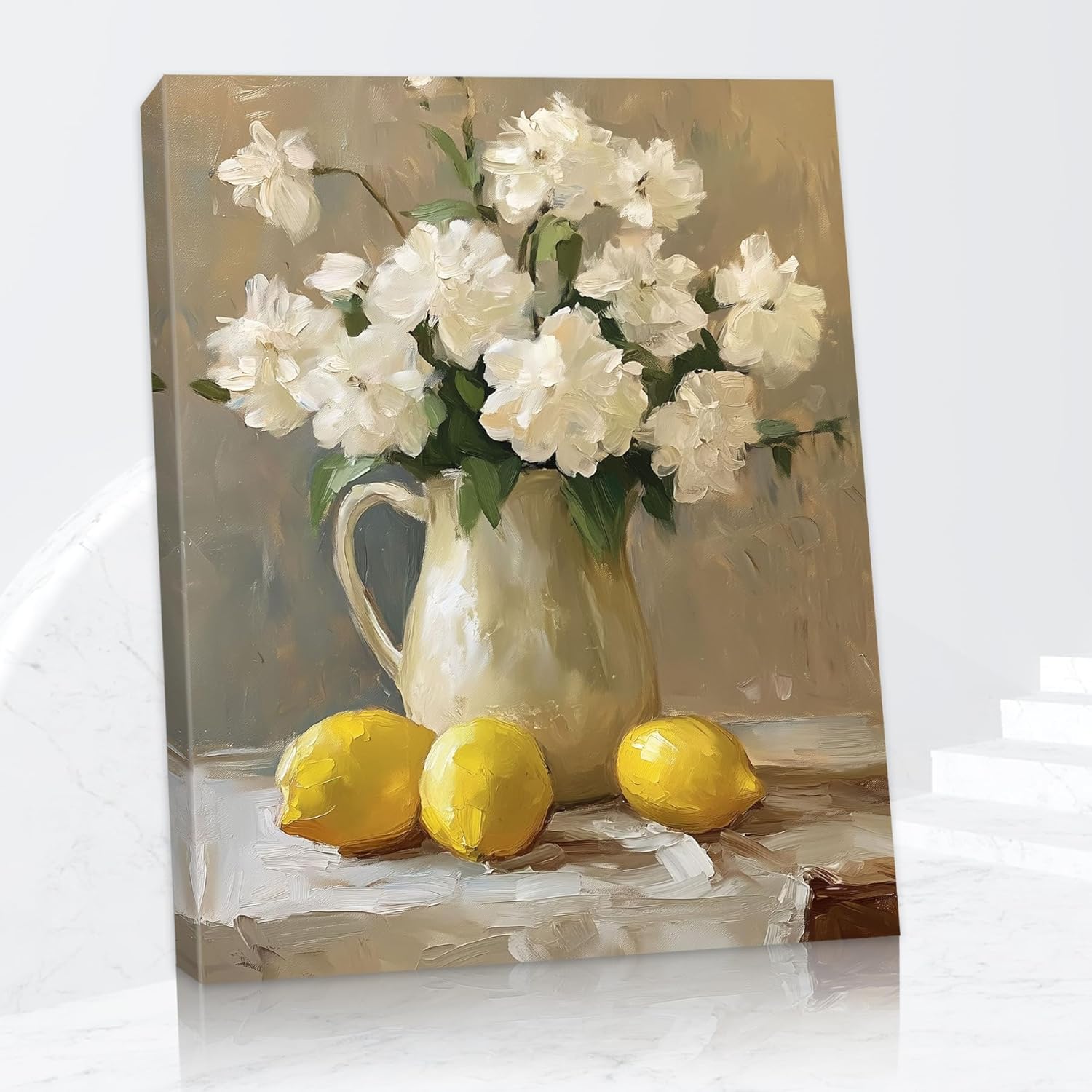 "Elevate your space with this stunning Still Life Fruit canvas wall art featuring a vibrant still-life composition. Imagine waking up to the sun-drenched beauty of the Mediterranean countryside. Our "Retro Still Life Lemon" canvas print captures that exact feeling, with a bountiful bowl of ripe lemons and a vase of fresh flowers sitting on a windowsill. The soft, natural light streaming through the window creates a warm and inviting atmosphere. This piece is more than just a picture; it's a portal to a world of tranquility and beauty. The vibrant colors and intricate details of the lemons, flowers, and window frame create a visually captivating masterpiece that will be the focal point of any room."