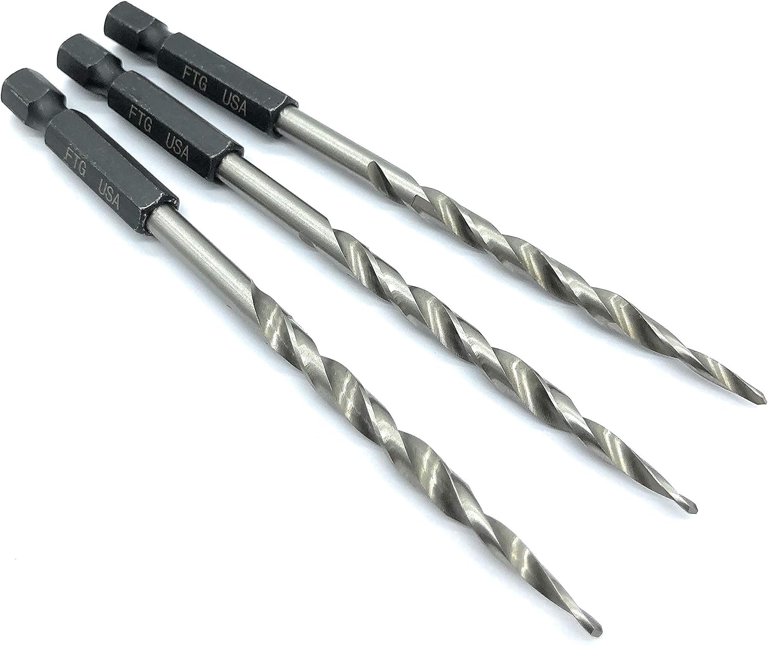 FTG USA 3 Pcs Adjustable Wood Countersink Value Pack same size (#8) 11/64" with 6 Piece Same Size #8 (11/64") Replacement Tapered HSS Drill Bits and Hex Wrench (1/8" Allen Key) feature the best woodworking tapered drill bits HSS M2 Grade 6542 , by far the most popular High Speed Steel, M2 has superior properties, including high toughness, wear resistance, and good cutting retention. Logo brand is laser printed on each countersink shank making it easier to differentiate this quality brand from others. Counterbore size 3/8", Plug size 3/8". Super sharp, very durable, easy to use, and built to perform well in both hard and soft woods. Drill, countersink and counterbore in 1 step.Top quality material #45 Carbon Steel adjustable four-cutter counter bore attachment that cuts fast and clears chips quickly for fast, smooth countersinking applications. The counter bore feature attaches flats on shank with 2 hex screws for a secure fit and can be adjusted for controlled pilot hole depth providing a clean finish for more polished final products. Hex Key (Allen Wrench) included. This product is Professionally manufactured in China at FTG USA specifications. Packaging set combination/design protected by US Copyright Office.