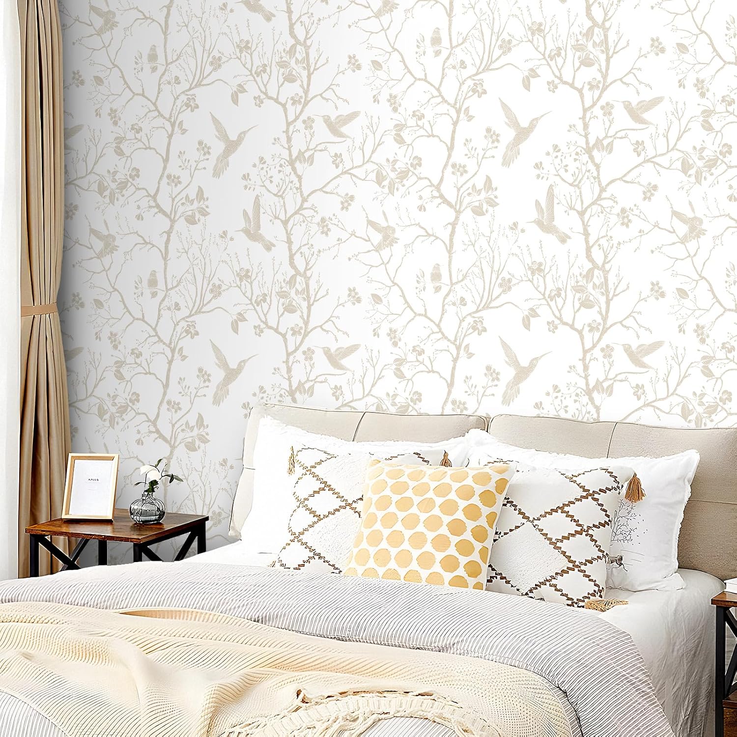 | Pattern | Beige and White Floral Bird Peel and Stick Wallpaper |