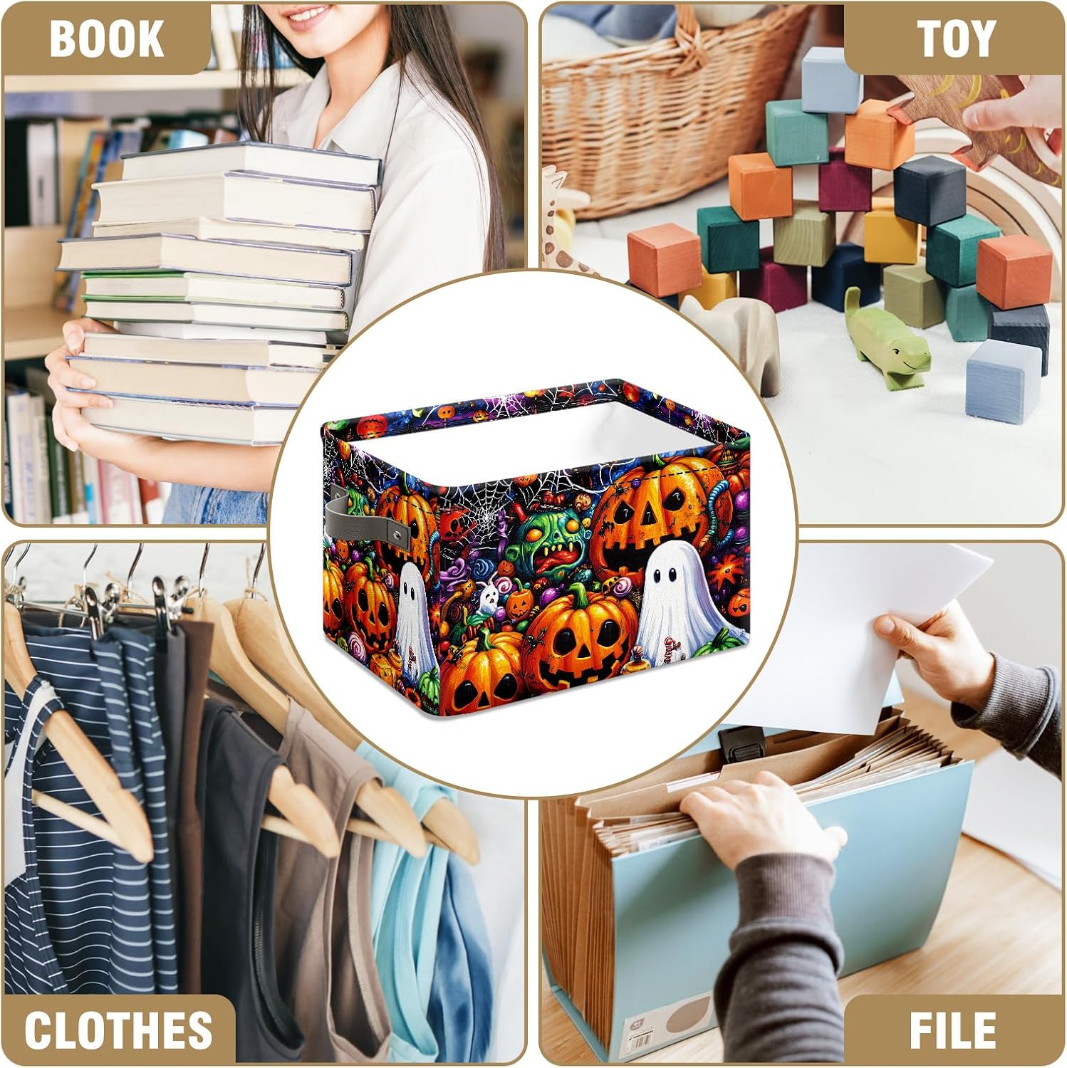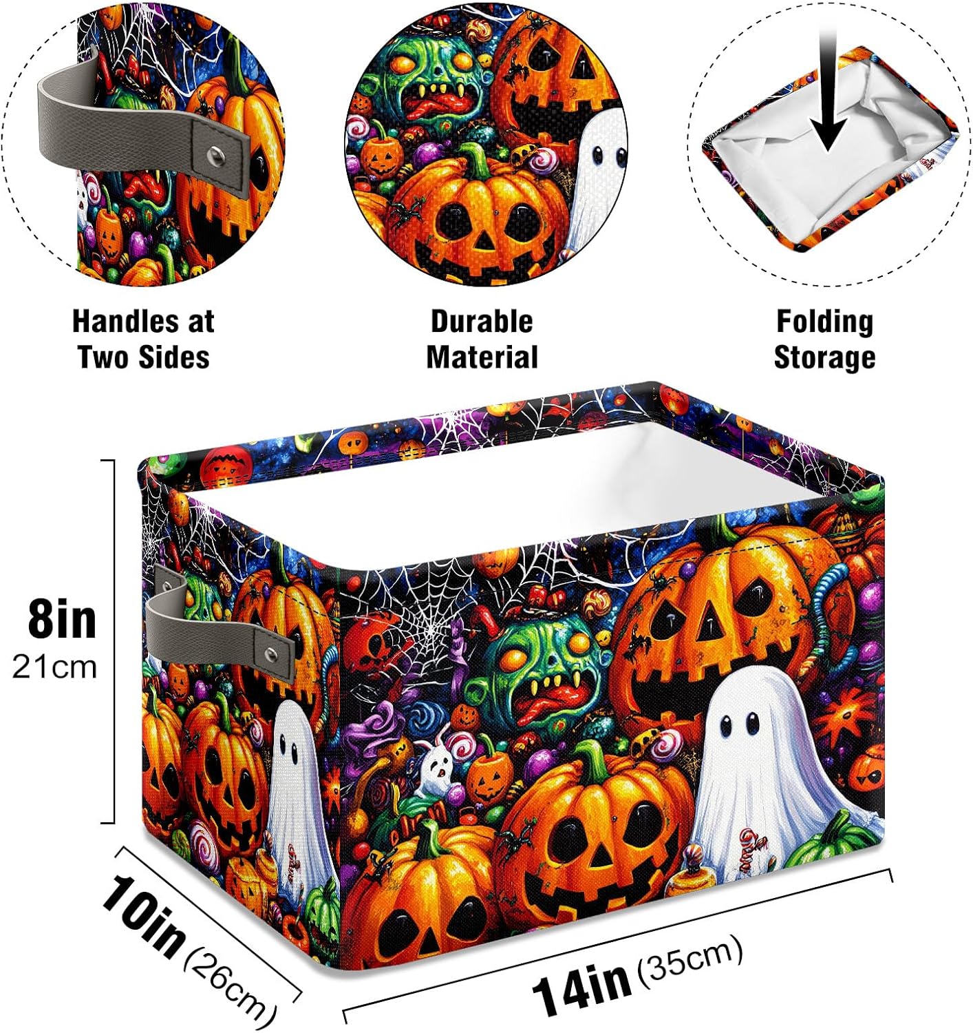 About this itemMATERIAL:outer material is canvas, the inner is white PE fabricSIZE:14 (L) x 10 (W) x 8 (H);FEATURE:Collapsible Design for Compact Storage allows you simply fold the basket down flat to 1 inch in height for easy storage if not in use. It can be easily folded up, opened, and placed where you need it.A sturdy metal rod frame around the top to keep the basket shape. With the PU handle on both side, moving conveniently. By strengthening the connection part, the handle will not be damaged even if heavy clothes or toys are loaded.MULTI-PURPOSE This high end storage bin can contain clothes, bags, towels, blankets, books, toys, dolls etc. It suits nicely in different occasions from .Rectangle storage baskets may be used as halloween gift storage box ,halloween storage containers,gift basket empty to fill books,toy, organizer storage for office supplies. It is ideal for decorative nursery, home office,living room, bathroom, utility rooms, crafts, playroom, dorms, condos, laundry room. Organizing baskets for shelves can be use alone or with a closet, shelves, cube bookshelf, cabinet.