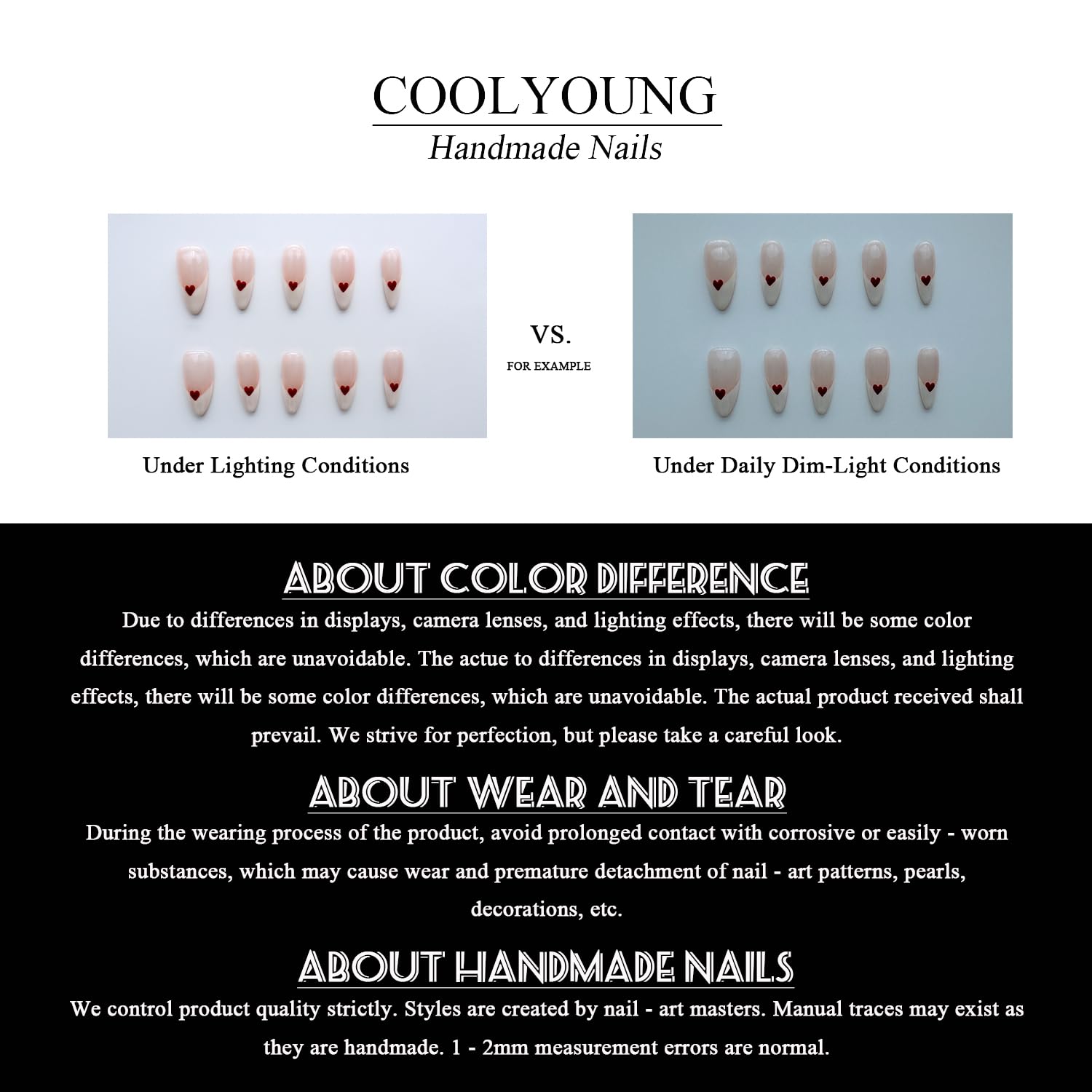 • Handmade with Care: COOLYOUNG natural press on nails are meticulously crafted by artisans using eco friendly resin. Each artificial nails short length set undergoes 12+ hours of hand-painting and polishing, ensuring seamless edges that mimic real nail texture