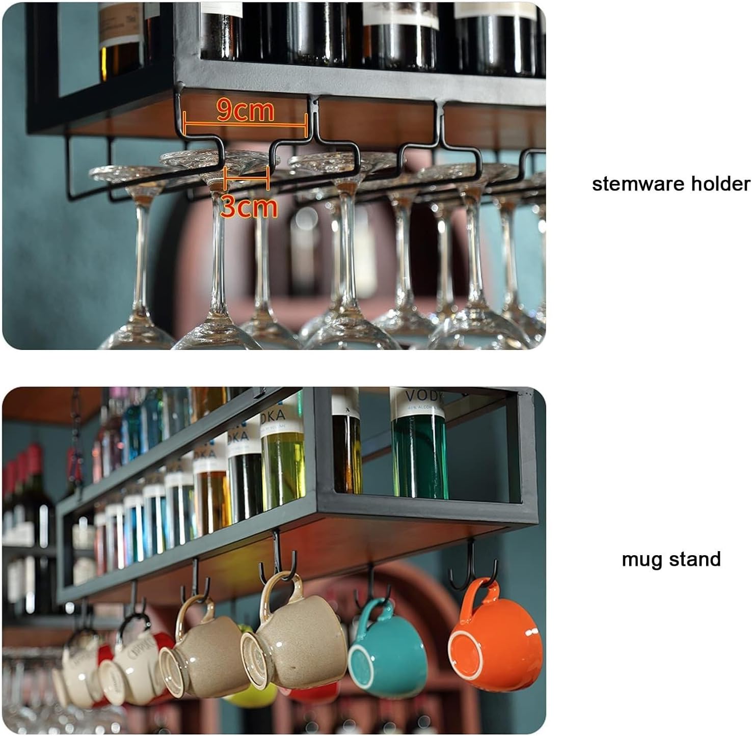 Upgrade your wine storage with this 100×25×100cm Hanging Wine Rack with Glass Holder, designed for both function and style. Crafted from heavy-duty iron and solid wood, this ceiling-mounted rack features a spacious upper shelf for wine bottles, décor, or plants, and two types of glass hangers underneath—accommodating various stemware such as goblets, champagne flutes, and wine glasses.With adjustable suspension chains (30–100cm), you can tailor the height to your ceiling space. Its sturdy construction supports up to 15–30kg, ensuring stability and safety in both home and commercial environments.Perfect for bars, kitchens, restaurants, and cafes, this industrial-style rack adds a vintage touch while saving counter space. The ceiling mount design also allows easy access from both sides, making it convenient and visually appealing.Specifications:Size: 60 / 80 / 100 / 120 × 25 × 100cmMaterial: Iron + Solid WoodLoad Capacity: 15–30kgColor: BlackStyle: European IndustrialPackage Includes:1 × Hanging Wine Rack (bottles and glasses not included)