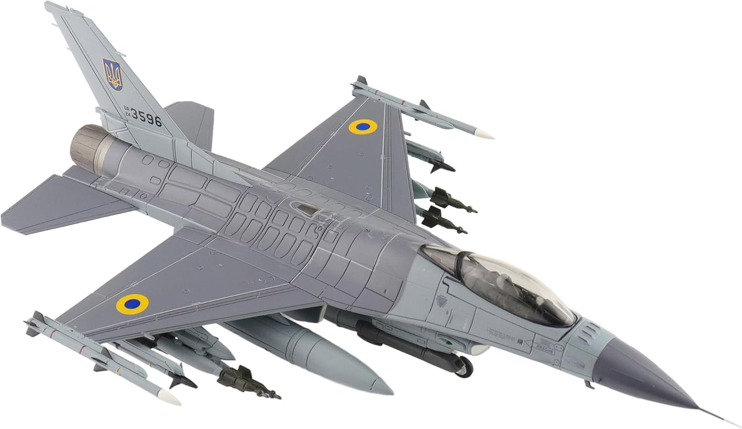 The Hobby Master 1:72 scale F-16AM "Ukrainian Air Force" model is a meticulously crafted diecast replica representing the modern fighter in its August 2024 configuration. Featuring authentic national insignia, a detailed cockpit, and advanced PIDS+ systems, this model measures approximately 8.5 inches in length. Designed for collectors aged 14 and above, it is an exceptional display piece that honors Ukraine's air defense excellence.