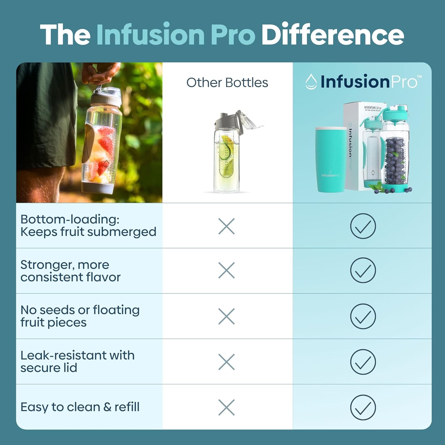| Additional Features | Bottom loading infuser for more flavor, 50 fruit infusion recipe ebook, non-condensing sleeve, pulp strainer |