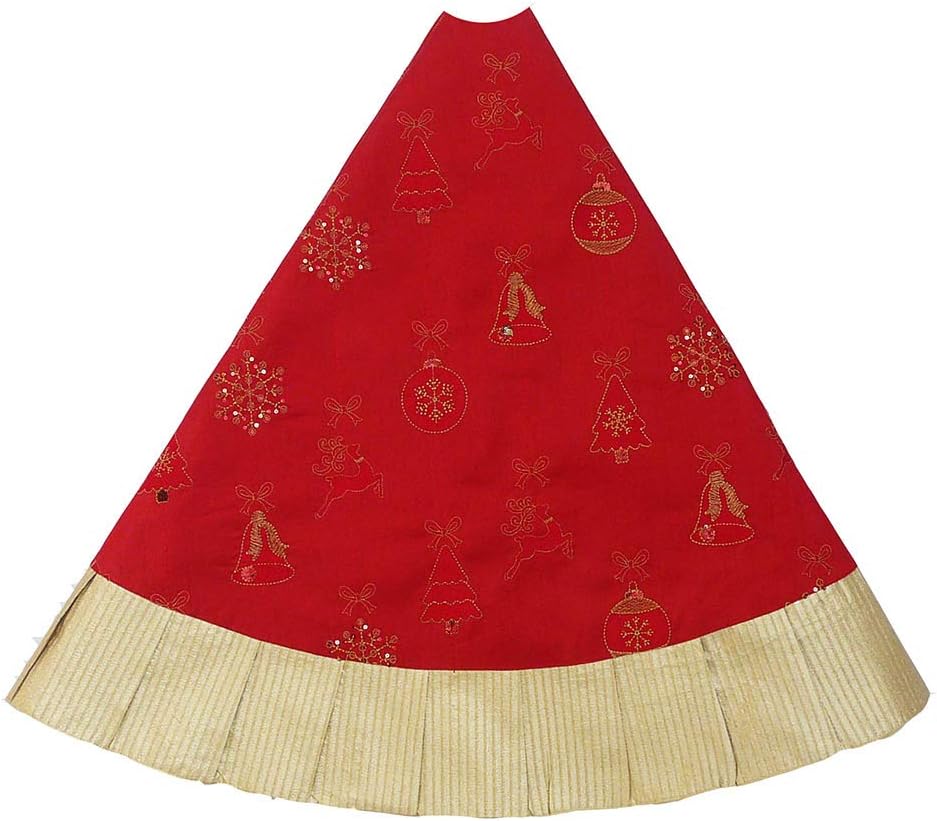 This Red and Gold Ornament Tree Skirt by Kurt Adler is a beautiful and festive way to add and accent the décor of your Christmas tree. This tree skirt has a rich red base with decorative ornament detailing. It is accented by a pleated gold border.