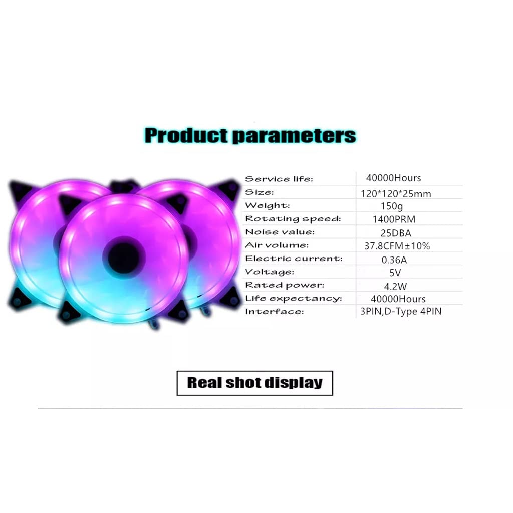 Product description:1. The light color and color changing speed can be adjusted through the remote control.2. Lower the computer temperature. Beautiful and peaceful.3. Switch various lighting modes through the remote control.4. Suitable for DIY computer.Rainbow lights make your computer more beautifulProduct parametersApplication: computer case fanCompatible CPU: Power: 4.2WBearings: Fluid BearingsFan life: 50000 hoursFan Speed Control: 1400 rpmNoise: 21dBAFeatures: Support RGBAir volume: 38CFMNumber of wires: 1 wire powerInterface: 6pinHeat sink material: plasticFan size: 120x120x25mmPackage Included:1 x Laptop Cooler (other demo products not included)Notice:1. Due to manual measurement, please allow 2-3% error.2. Due to different monitors, the color may be different, please understand.Circulating refrigeration structure, vortex heat dissipation.