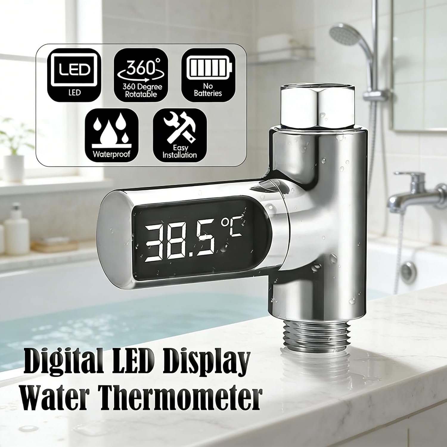 "LED Digital Water Thermometer (Gen 2): Smart Temperature Gauge for Bathroom & KitchenTired of guessing water temp for baths, kitchen tasks, or daily routines? Our Gen 2 LED Digital Water Thermometer delivers precision, convenience, and zero hassle—with upgrades that outperform Gen 1.Key Upgrades: Gen 2 vs. Gen 1Keep the reliable basics (durable materials, water flow power) + add game-changing features:Wider Temp Range (0-100°C/32-212°F): Covers cool baths to hot kitchen liquids (Gen 1: 5-85°C) + switchable °C/°F units (Gen 1: only °C).3-Color Temp Indication: Blue/green/red lights let you instantly spot safe temps (no squinting—Gen 1: no indicator).Flexible 360° Screen: Fits 1/2-inch (4-point) universal nuts; install the screen either side (Gen 1: right-only) + gravity sensing resets rotation for easy reading.Water Flow Power: No batteries—turn on water to activate (same as Gen 1, zero extra costs).Built-In Water Timer: Track usage duration (Gen 1: no timer)—perfect for efficient bathing/cleaning.Durable for Daily UseMade of ABS electroplating, PC, and copper screws (sturdy, water-resistant)—ideal for humid bathrooms or busy kitchens.Versatile for Every Home TaskUse this water temperature thermometer for:Bathroom: Safe bath/shower tempsKitchen: Hot drink/meal prepDaily: Cleaning, water efficiency tracking"