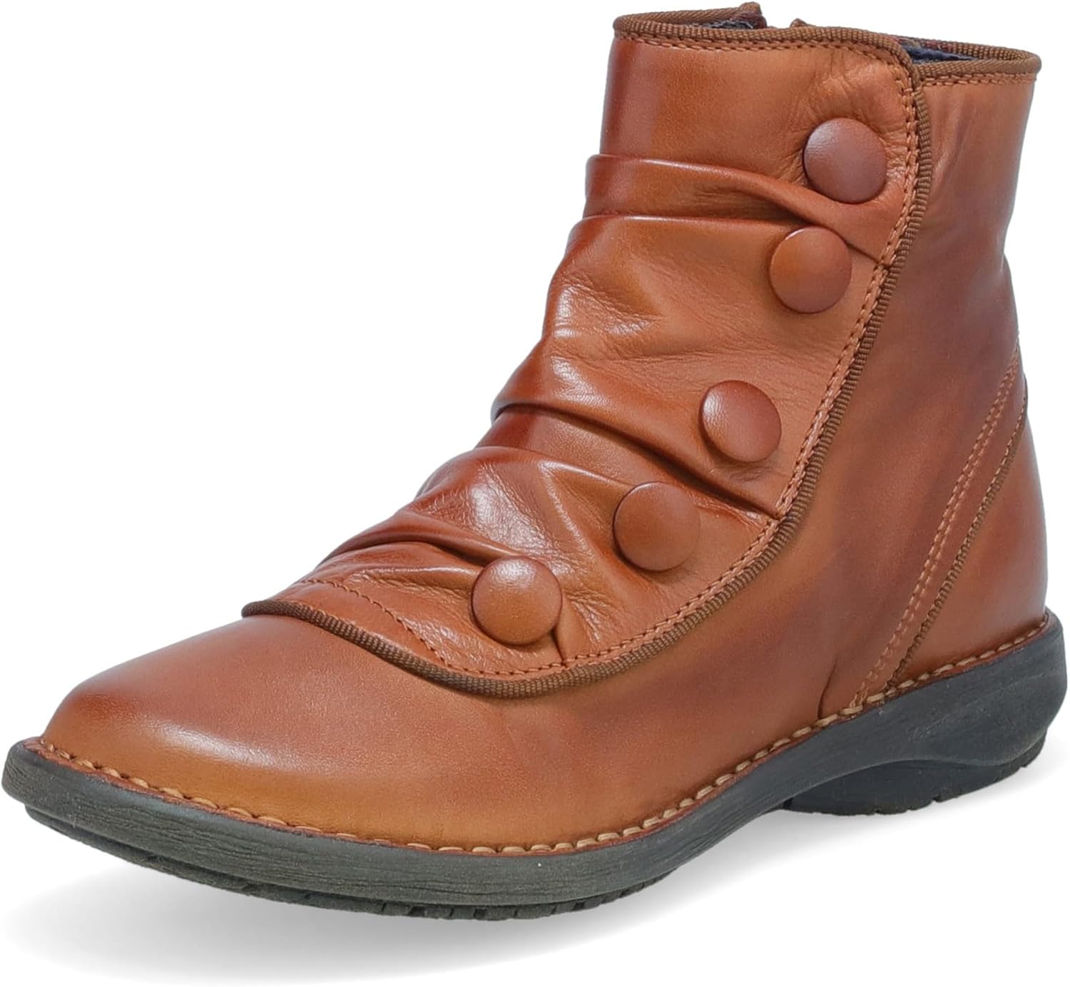 Vintage influence shines through in the Miz Mooz Pumpkin ankle boot. A ruched leather upper, burnished finish, and signature button detailing bring warmth and charm, while a cushioned rubber outsole and hidden interior zipper offer comfort and ease of wear. Approachable and nostalgic, the Pumpkin invites you to prioritize yourself.
