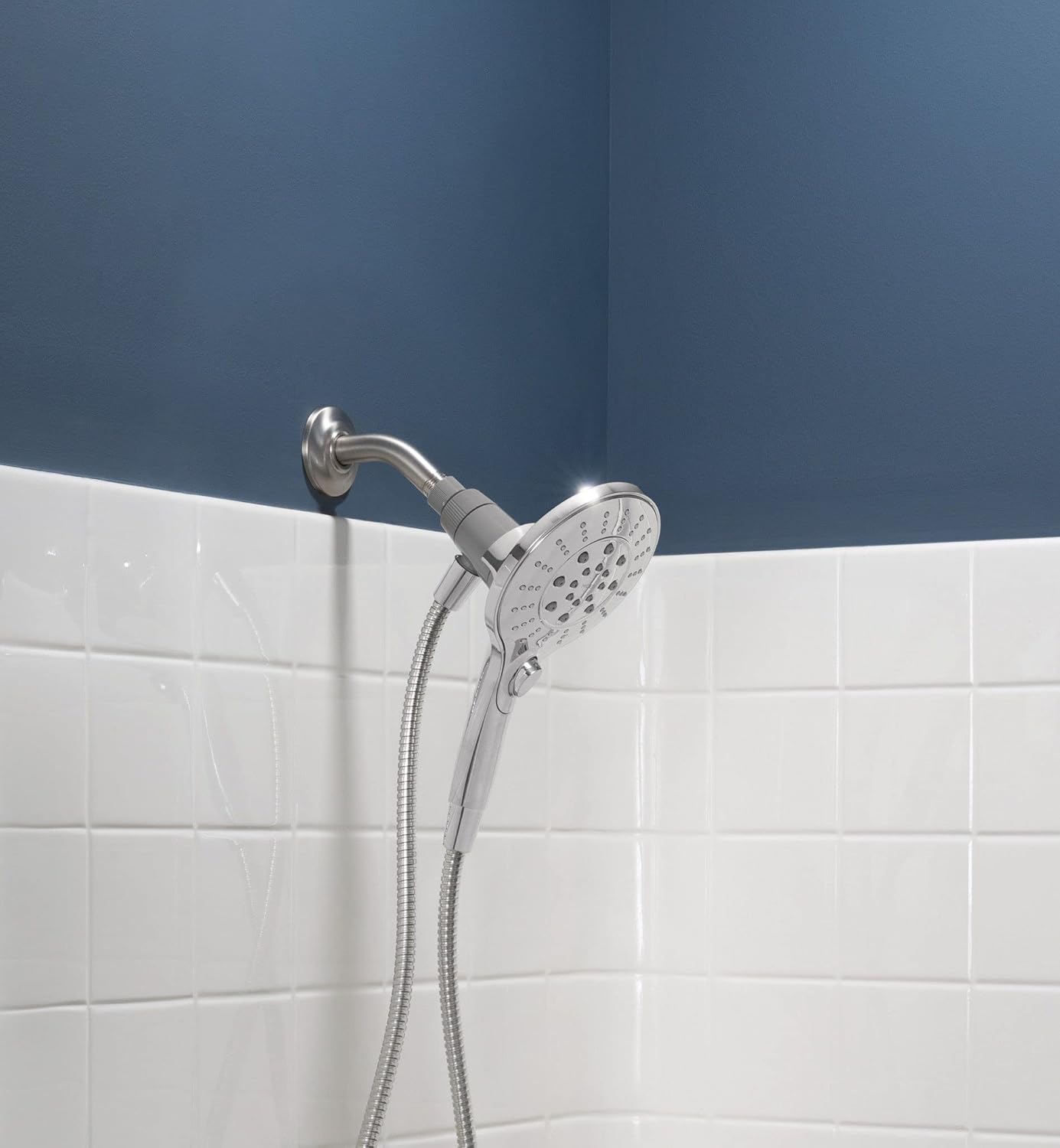 Inspired by patterns found in nature, the Engage Magnetix Showerhead offers a distinctive design which is at home in any decor. Chrome finish is highly reflective for a mirror-like look that works with any decorating style. Large 5.5 inch diameter spray head hand shower for maximum coverage. Customize your shower at the push of a button by clicking through six optimized settings. Magnetix docking allows for easy release and return with magnetic docking system, even with you eyes closed. This showerhead always docks facing forward to avoid exterior splashing outside your shower. Includes a kink-free metal hose that extends reach and flexibility.