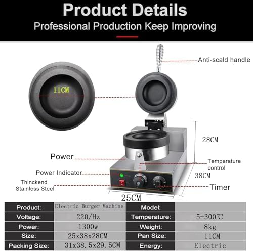 Introducing the Electric Burger Machine, your ultimate solution for crafting mouth-watering burgers in both commercial kitchens and home settings. This innovative appliance is designed to enhance your cooking experience, delivering restaurant-quality burgers efficiently. Built with safety and stability in mind, the machine features four reinforced feet to ensure it remains steady while you focus on creating delicious meals. The non-stick baking pan keeps your bread intact and visually appealing, making cleanup effortless. Thanks to its dual-sided heating design, this burger maker guarantees even cooking for perfectly baked burgers every time. The durable stainless steel body offers a sleek look while resisting high temperatures, ensuring reliability in any kitchen environment. Key Features: 1. Generously sized 10/11 cm inner diameter molds allow for a variety of flavorful fillings. 2. Adjustable temperature control (50-300°C) gives you the flexibility to tailor your cooking preferences. 3. A powerful 1300W heating element provides rapid heating and high output efficiency, ideal for home cooks and commercial use alike. 4. The easy-to-clean cast aluminum mold with Teflon coating simplifies the cooking process, so you can spend more time enjoying your creations. 5. An integrated timer with an alarm function ensures you never miss the perfect cooking moment. Specifications: - Power: 1300W/1300W/2600W - Mold Coating: Non-stick - Mold Material: Cast Aluminum - Main Body Material: Stainless Steel - Temperature Range: 50-300°C - Timing Function: 0-5 minutes - Product Size: 25x38x28CM / 25x49x31CM / 50x49x31CM - Gross Weight: 8kg/10kg/18kg Package Includes: - 1 x Hamburger Maker Mold Elevate your culinary creations with the Electric Burger Machine, where quality meets convenience, making it an excellent choice for delicious burgers at home or in your restaurant.