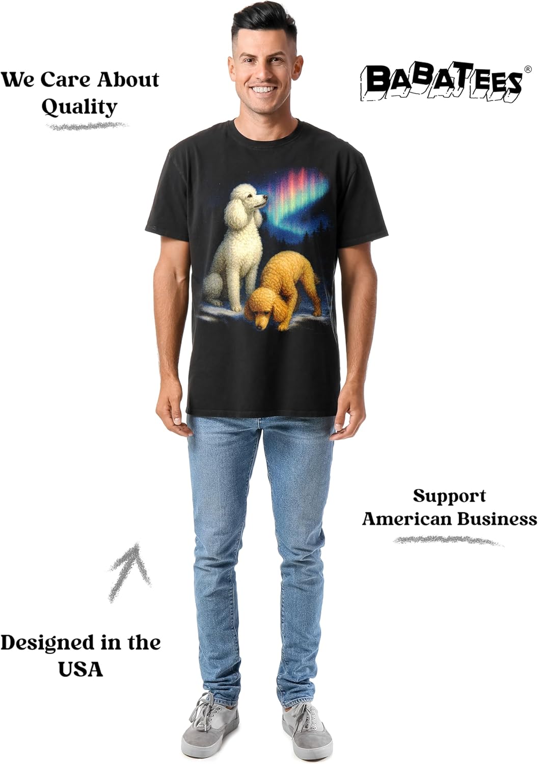 Step into a world of whimsy with this unique unisex t-shirt featuring two poodles set against a mesmerizing night sky. Drawing inspiration from the iconic wolf t-shirts of the 70s, 80s, and 90s, this design puts a delightful twist on a classic theme. The dramatic scene showcases elegant poodles beneath the ethereal glow of the aurora borealis, complete with a luminous moon and twinkling stars. Crafted from 100% midweight cotton, this durable t-shirt ensures both comfort and longevity. Perfect for poodle parents and dog enthusiasts alike, this conversation-starting design combines artistic flair with a touch of humor. The versatile unisex cut makes it suitable for both men and women who want to showcase their love for these sophisticated canine companions. Whether you're a poodle mom, dad, or simply appreciate unique artistic expression, this high-quality t-shirt offers a distinctive way to display your passion for these beloved pets.