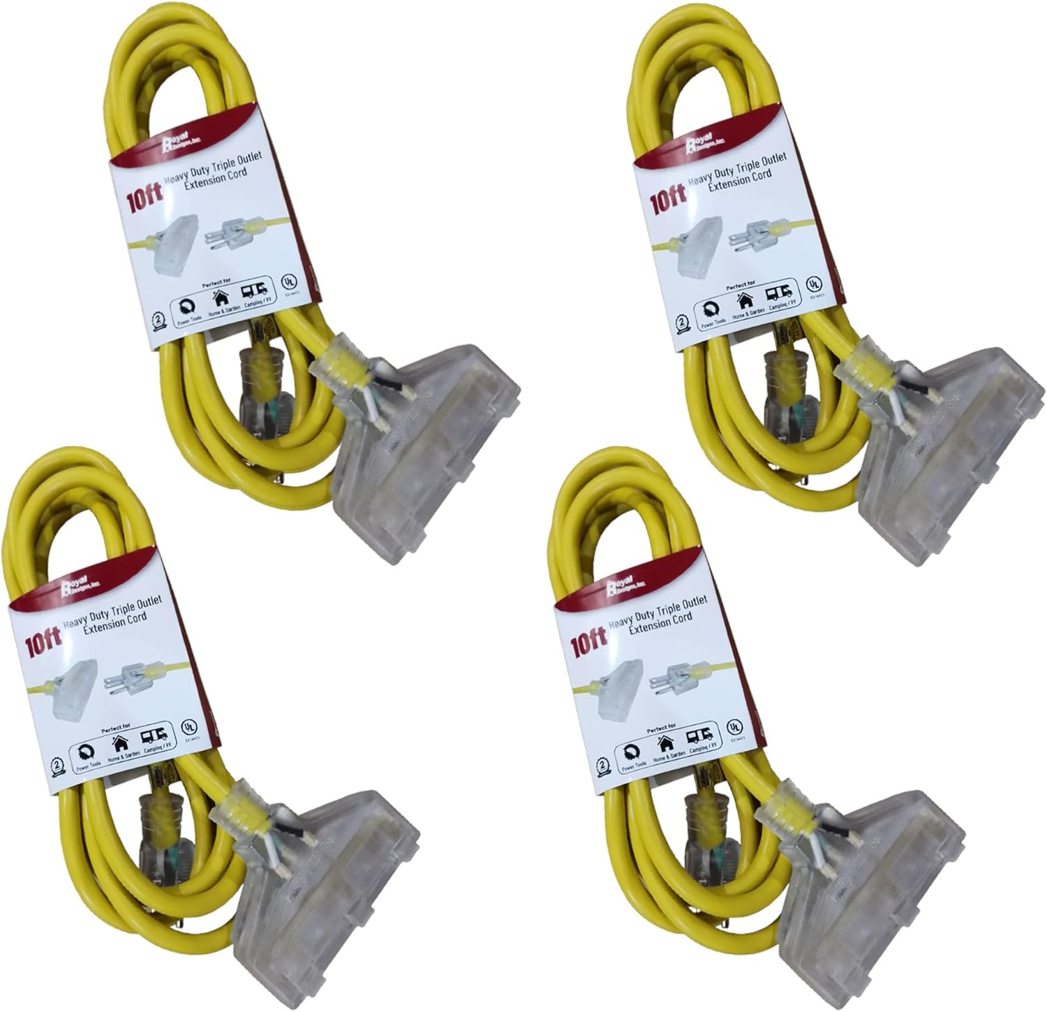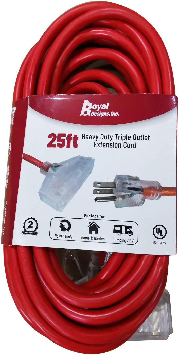 Royal Designs UL-Listed 15 Amp 12 gauge / 3 Wire triple outlet extension cord 2-Pack allows you to extend your power up to 25 feet. This extension cord has a clear three-prong plug as well as a clear triple outlet piece with indicator light. Perfect for any tool such as generators, power tools (saws, drills, air compressors), lawn equipment, vacuums, heaters, chargers, etc. The heavy duty vinyl jacket helps resist abrasion and prolonged exposure to the environment, making it perfect for both indoor and outdoor use.. Specification: Length: 25 feet Plug Format: A- US style Function: Extension cord/Wire Color: Red Warranty: 2 years Features: Multiple Uses Extension cord Easy to install Polarized UL plugs vinyl jacket resists moisture, abrasion and prolonged exposure to sun