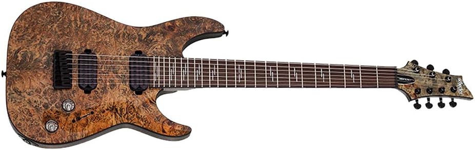 A Spellbinding Addition to the Omen Lineup With its bewitching burl top and hair-raising Heretic pickups, the Schecter Omen Elite-7 is one seven-string you won't be able to keep your hands off for long. The Omen series has been a longstanding favorite to players and customers here at Sweetwater, and we feel the Omen Elite-7 marks a notable upgrade in all the right directions. Back are the substantial-feeling mahogany-maple construction and streamlined electronics. But factor in a slew of visual upgrades, a fast-as-ever Thin "C" neck, and mean-sounding set of hot-rodded Heretic pickups, and this Elite is one Omen that's too good to pass up.Poplar burl top One of the Omen Elite-7's standout features has to be its deeply figured poplar burl top. As a tonewood, poplar — a common alder alternative — is known for its light weight, resonant qualities, and meaty tone. And combined with its compelling visual