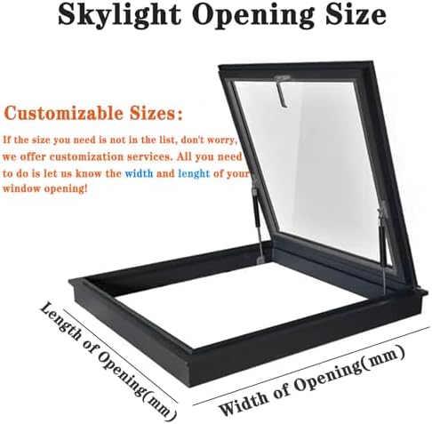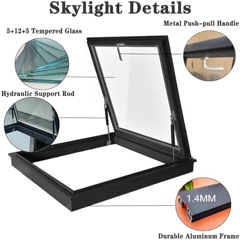 Transform your outdoor spaces with our premium recessed skylights, designed to illuminate various structures such as roofs, sheds, barns, and basements. Crafted with durable tempered glass, these skylights enhance natural light flow, significantly improving the functionality and ambiance of any area. Ideal for homeowners looking to brighten up their living or work spaces, our skylights are built to endure harsh weather conditions while providing excellent impact resistance. Key Features: 1. **Durable Construction**: Made from high-quality aluminum alloy, our skylights ensure long-lasting performance and resilience. 2. **Excellent Sealing**: The innovative sealing strip and groove pipe positioning create a strong barrier against the elements, offering outstanding sound insulation alongside weather resistance. 3. **Easy Maintenance**: The sleek glass surface and thoughtful design allow for effortless cleaning with a soft cloth, keeping your skylight looking pristine. Specifications: - **Name**: Skylight - **Material**: Aluminum and Tempered Glass - **Aluminum Thickness**: 1.4 mm - **Height**: Approximately 11 cm - **Tempered Glass**: 5+12A+5mm Hollow - **Skylight Opening Angle**: 0-80° - **Product Sizes Available**: - 400X400mm (15.7X15.7in) - 450X450mm (17.7X17.7in) - 500X450mm (19.7X17.7in) - 500X500mm (19.7X19.7in) - 550X450mm (21.6X17.7in) - 550X500mm (21.6X19.7in) - 550X550mm (21.6X21.6in) - 600X450mm (23.6X17.7in) - 600X500mm (23.6X19.7in) - 600X550mm (23.6X21.6in) - 600X600mm (23.6X23.6in) - 650X450mm (25.5X17.7in) - 650X500mm (25.5X19.7in) - 650X650mm (25.5X25.5in) - 650X700mm (25.5X27.5in) - 700X700mm (27.5X27.5in) **Custom Sizes Available**: We offer customization options for size requirements. Please feel free to contact us for any specific dimensions! **Package Includes**: 1 x Roof Skylight Elevate your space with our skylights and enjoy the benefits of natural light combined with quality you can trust.