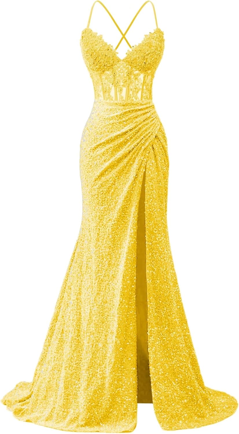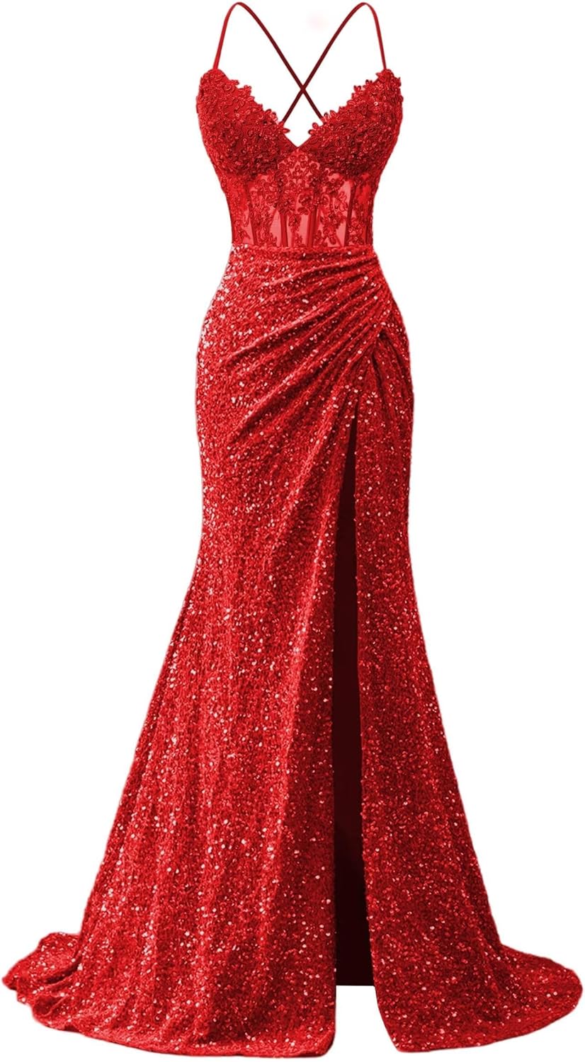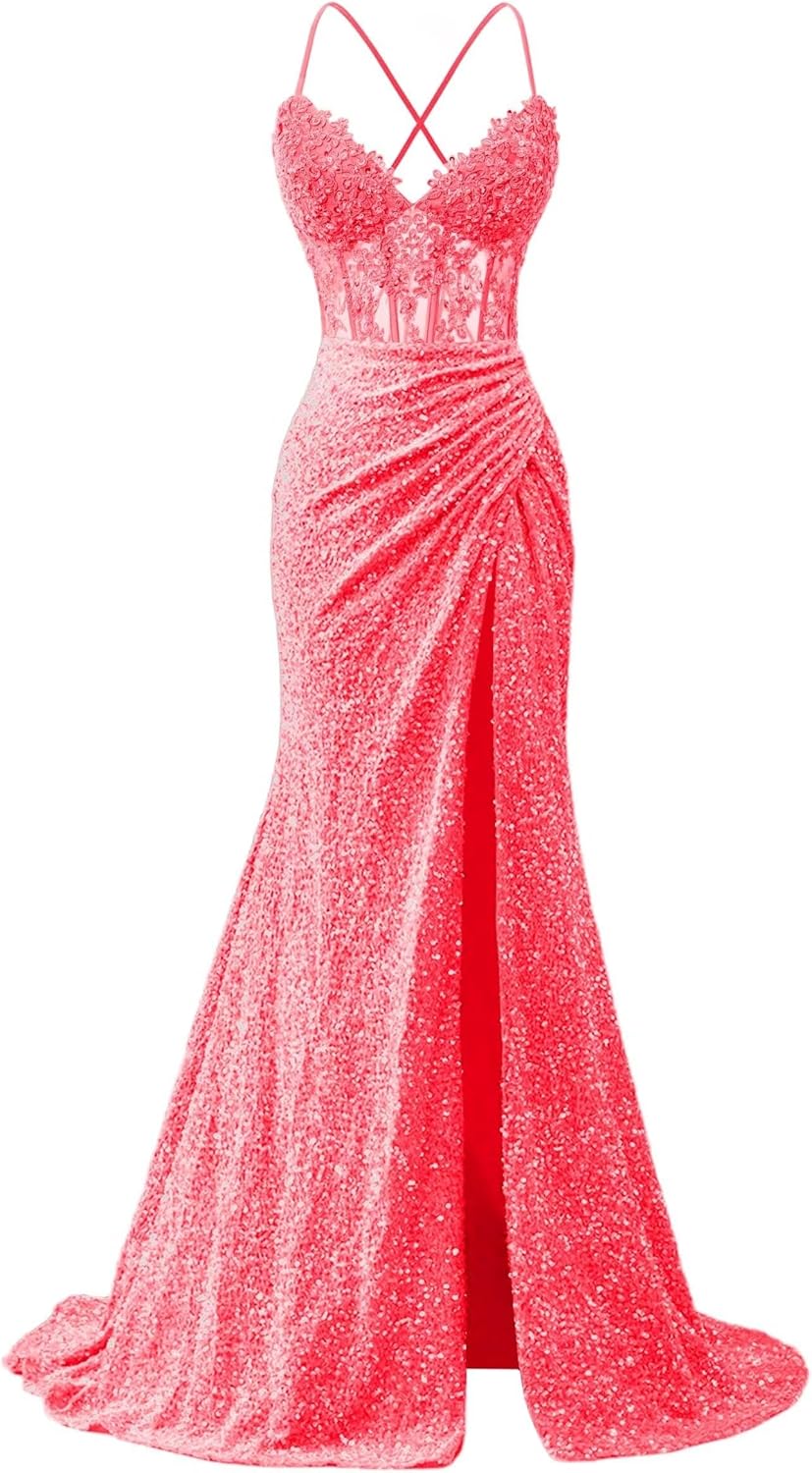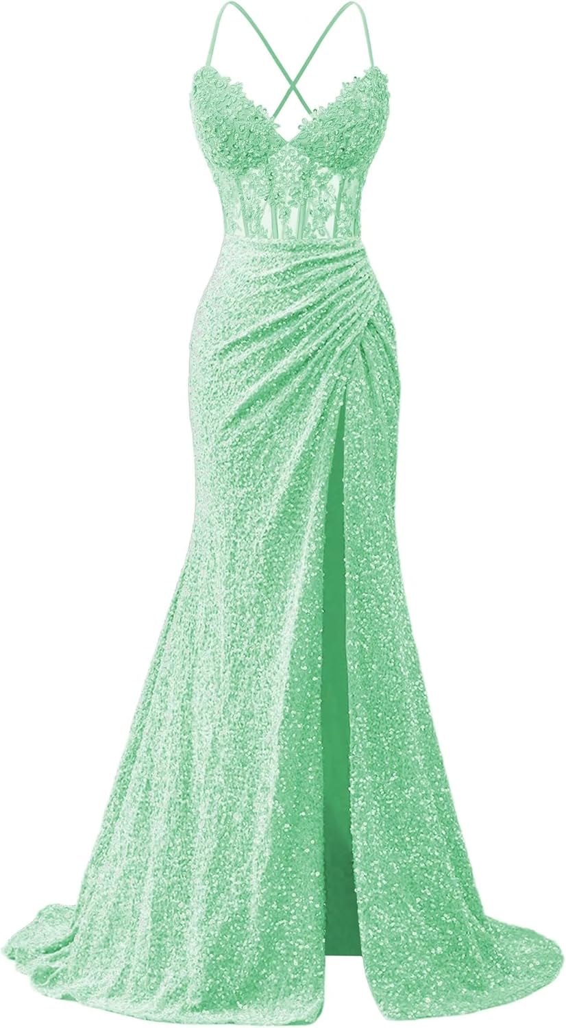 | Fabric Type | Sparkly Sequin Lace Appliques Spaghetti Straps Mermaid Slit Long Prom Dresses |